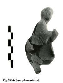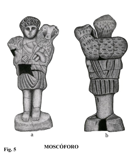 Una figura como la del moscóforo es un hecho muy socorrido en el mundo antiguo, y revela, como la anterior, lo frecuente que era manifestar los episodios rústicos más habituales. La técnica de su ejecución, como se puede ver tanto en el dibujo como en la lámina fotográfica, es de baja calidad (fig. 5). Si se observan los puntos de unión laterales, se ve con claridad que se ha utilizado el procedimiento del doble molde. El uso de la paleta y el punzón se observa bien en los costados, cabeza y espalda.
