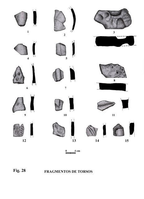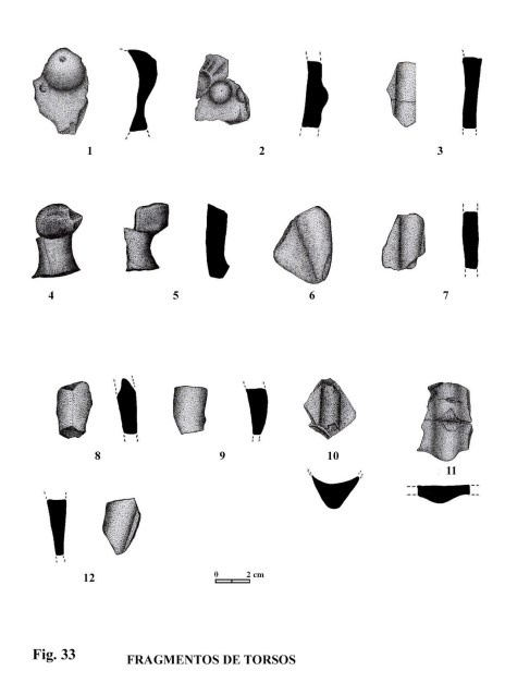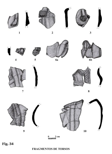 Altura: 3,4 cm. Este fragmento de torso presenta, de forma muy mar-cada, la parte central de un torso, con indicación de un brazo, pero donde no se aprecia la mano por defecto de su estado de conservación.