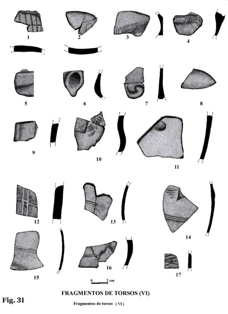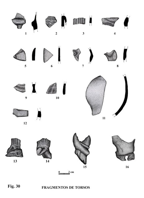 Nos llama la atención observar que, entre las mismas figuras, se encontraron fragmentos amorfos, como si fueran desechos o recortes pertenecientes a los retoques que se hacían a las figuras, una vez modeladas (fig. 30, nº 13, 14,15,16). Ese supuesto factor, el desecho, da pie a creer que podría tratarse de un taller, aunque esto sólo es una suposición.