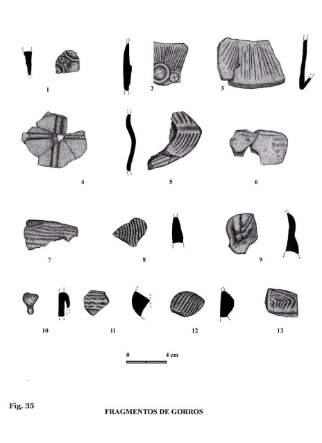 Altura: 2,2 cm. Forma parte de un gorro, con sus características incisio-nes, similares a las de las figuras de dama sobre pedestal.