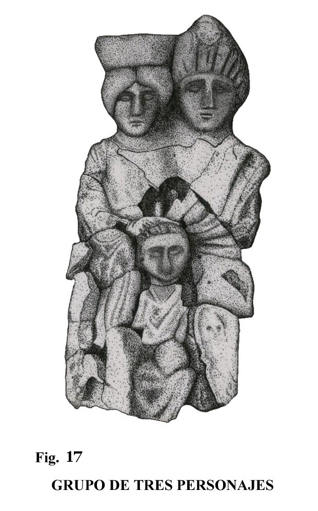 Una consideración especial merece el grupo formado por una pareja, sobre asiento, con niño a los pies y situado delante de ellos. La figura 17 muestra probablemente un matrimonio de carácter real. Tanto hombre como mujer llevan sobre sus cabezas sus respectivos gorros, uno de forma tronco-cónica, el hombre, y la otra, como una corona muy rudimentaria, la mujer.