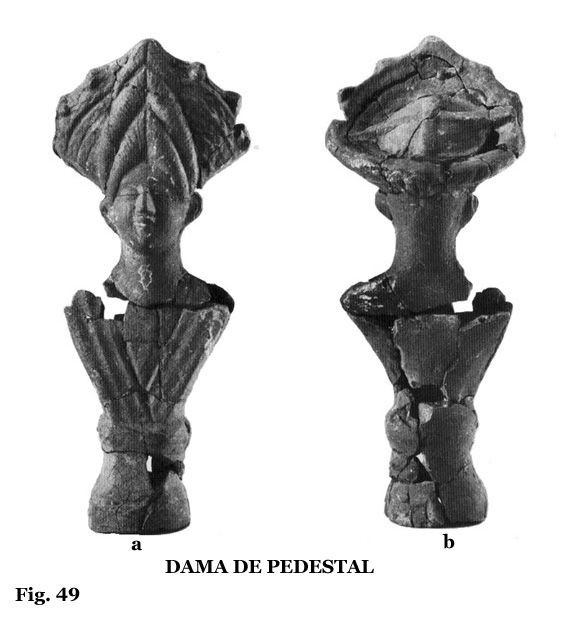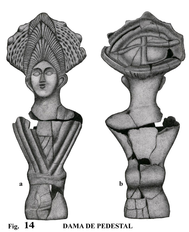 Las figuras de pedestal, 12, 13 y 14, son bustos de mujer, que destacan por la belleza de su ejecución. La colección de terracotas del Museo Municipal de Priego de Córdoba constituye un ejemplo de elementos paralelos en lo referente al modelo de figuras femeninas de pedestal, con la salvedad de que estas son del s. II d. C., y no han sido halladas en tumba de incineración.