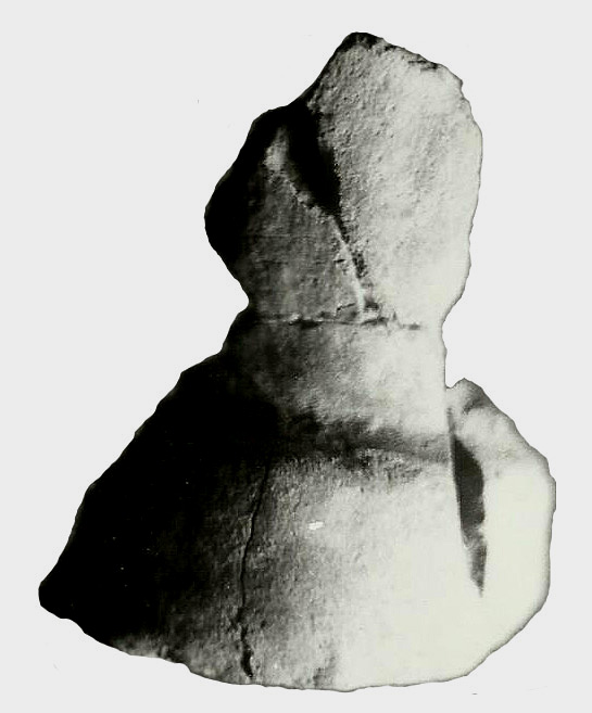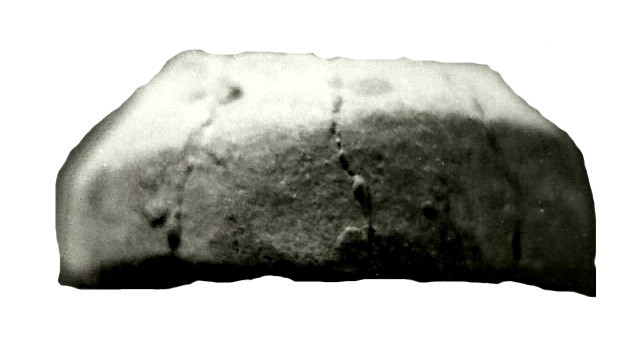 Altura: 2,5 cm. No se puede concretar si pertenece al pecho o vientre, pero muestra un rasgo profundo de incisión decorativa.