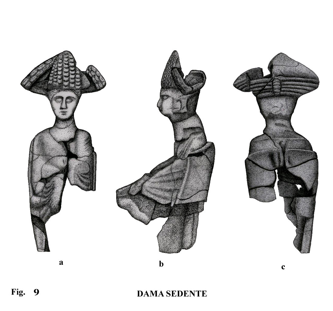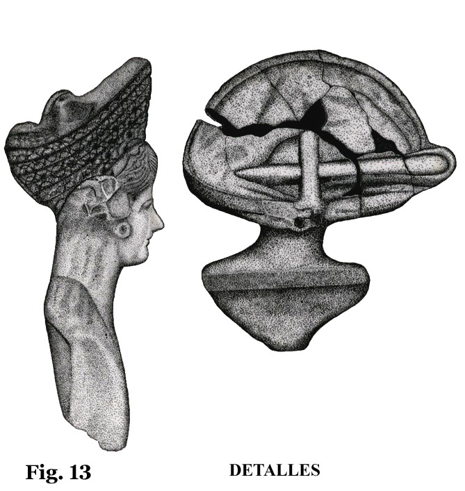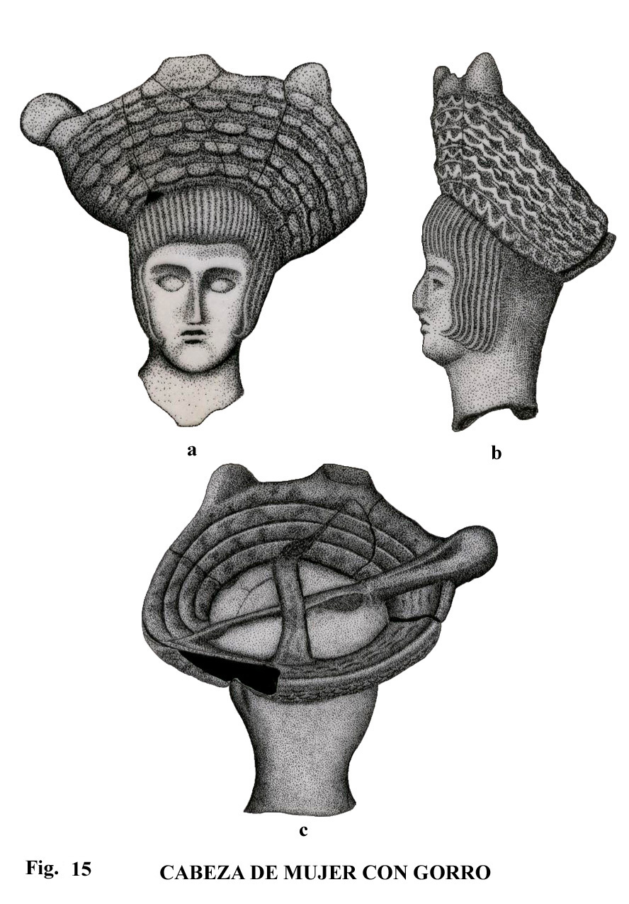 En la figura 21-5, de proporciones reducidas, se puede comprobar la existencia de detalles, como una diadema, con peinado y moño recogido en la parte de su nuca. Hay algún paralelo en la provincia de Cádiz, pero de tamaño superior y en diferente material.