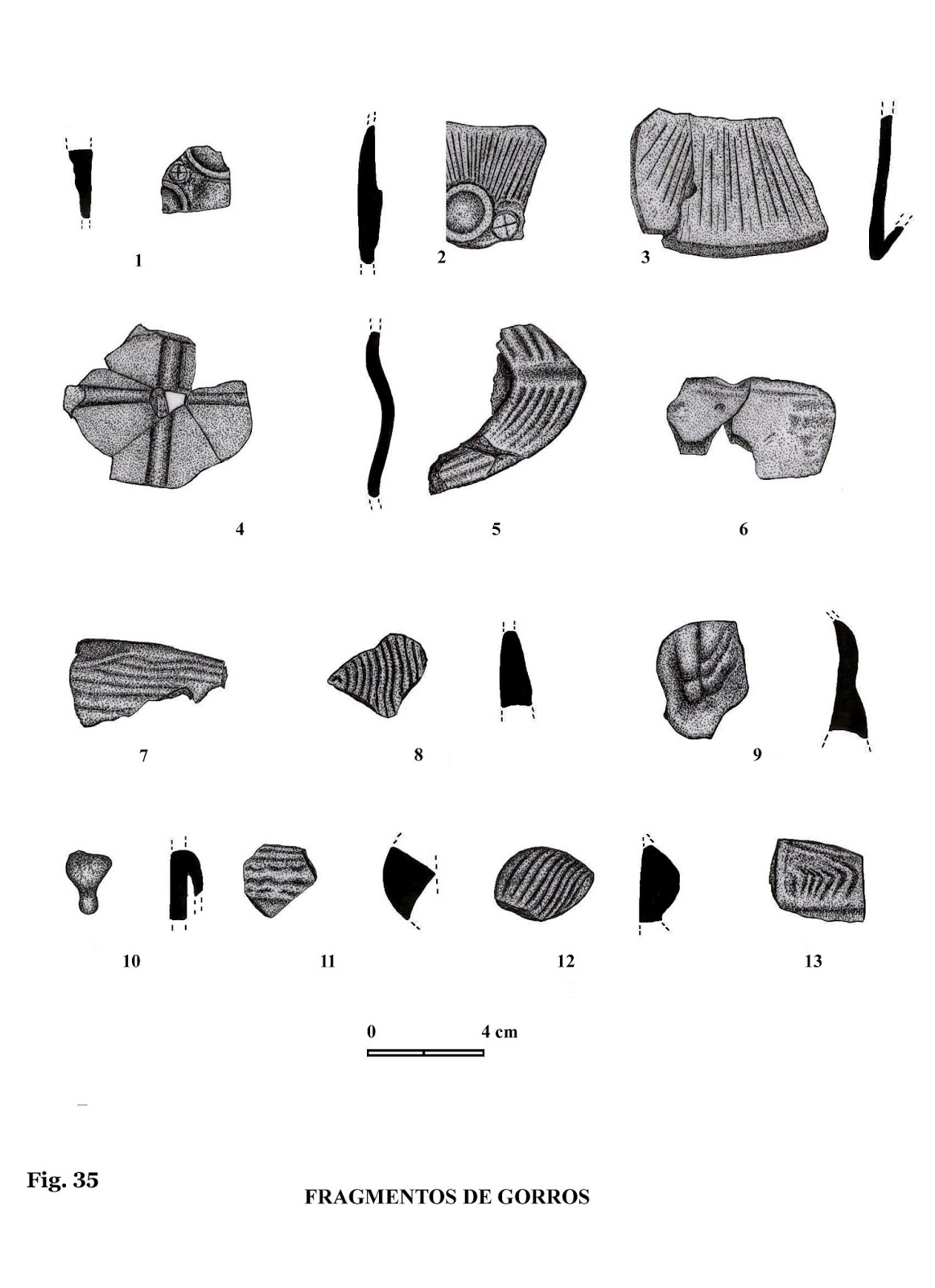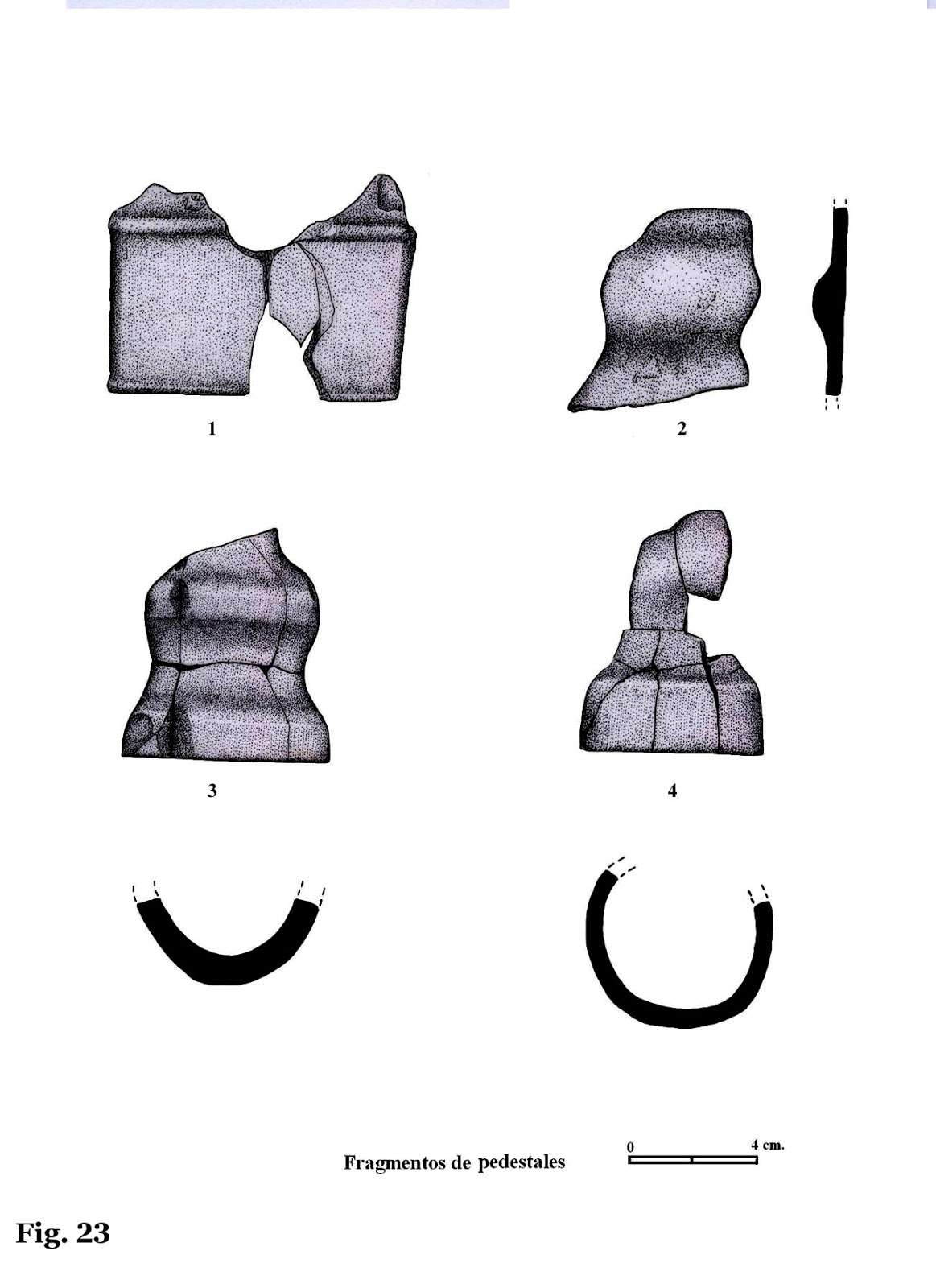 Hay algunas figuras que muestran una base que es el inicio de su propia forma, como se puede ver en las figuras 7 y 9, y en gran cantidad de fragmentos.