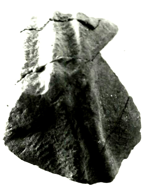 Altura: 3,2 cm. Por la misma razón del anterior, este trozo debe pertenecer a una parte de la espalda de figura, con incisiones que se cortan en ángulo recto.