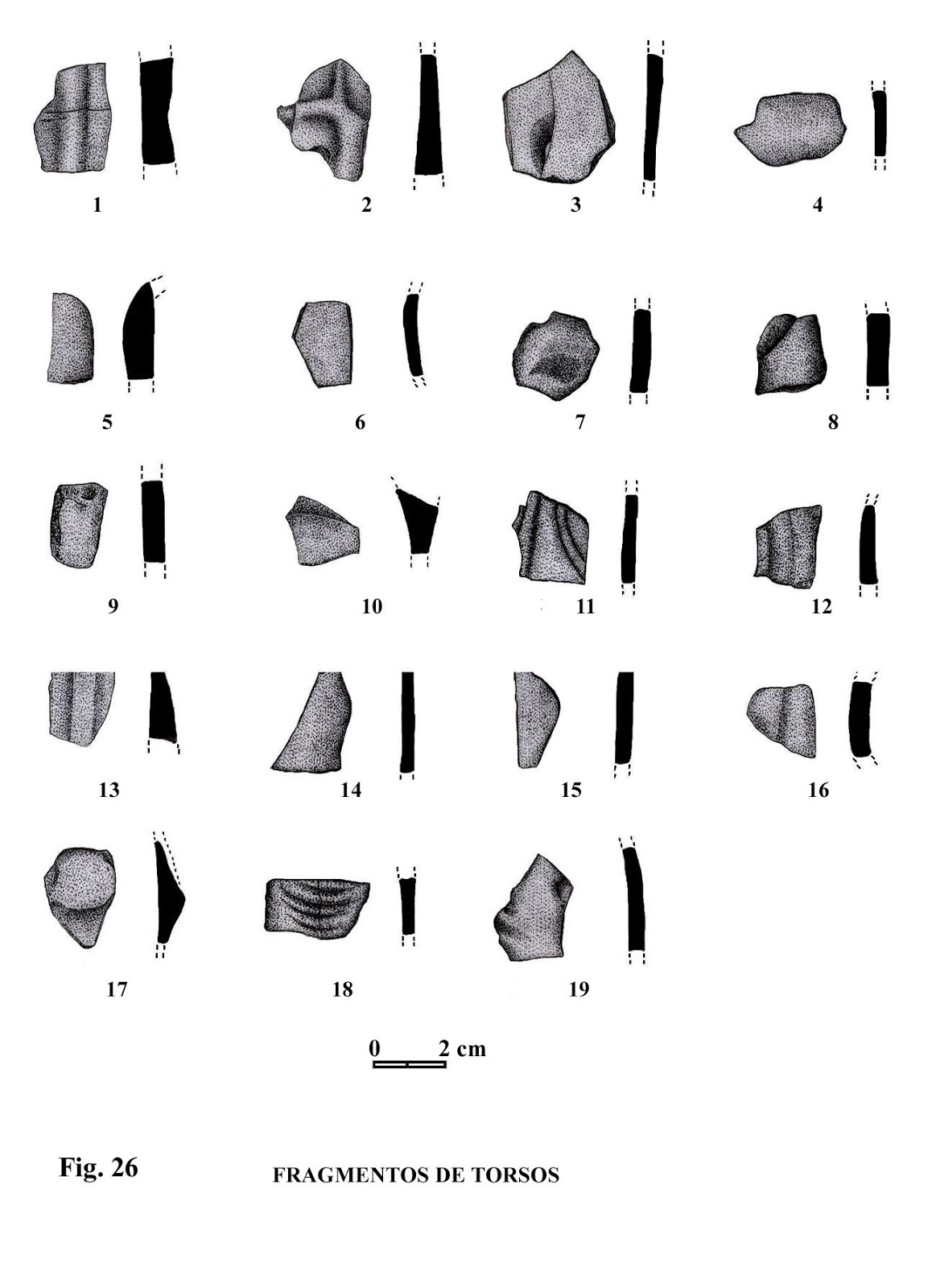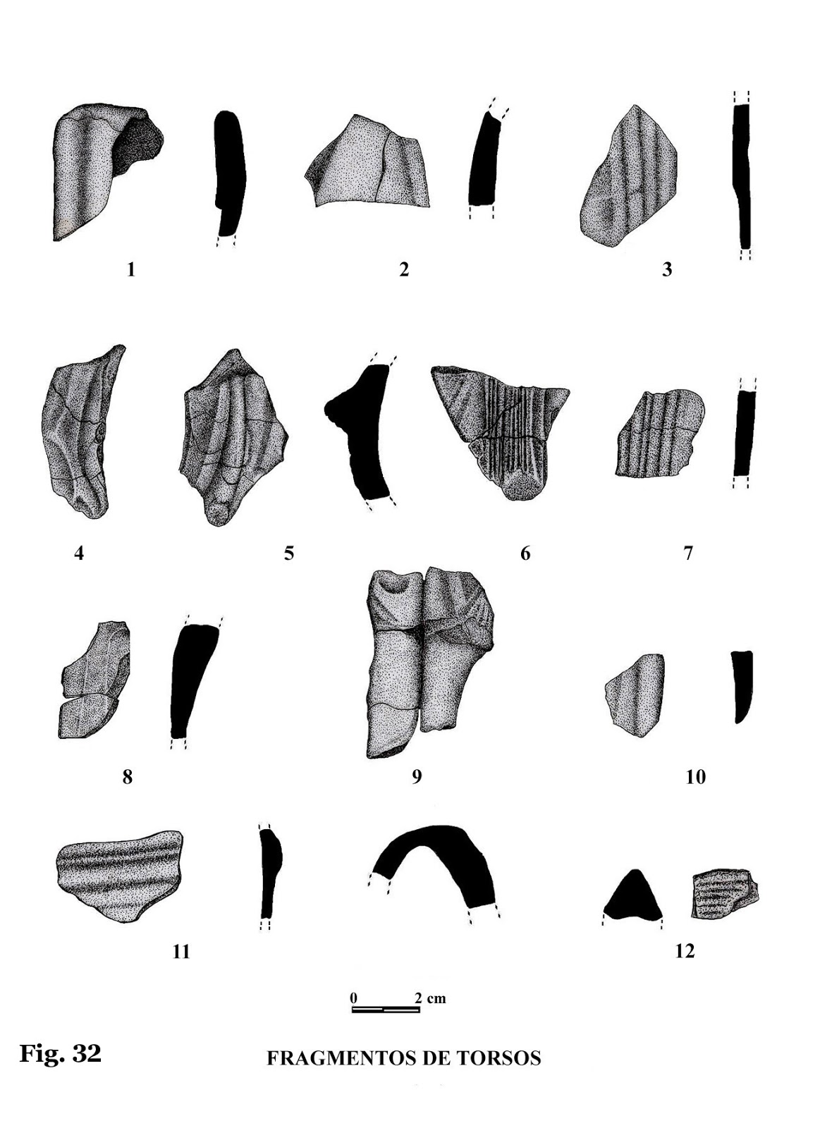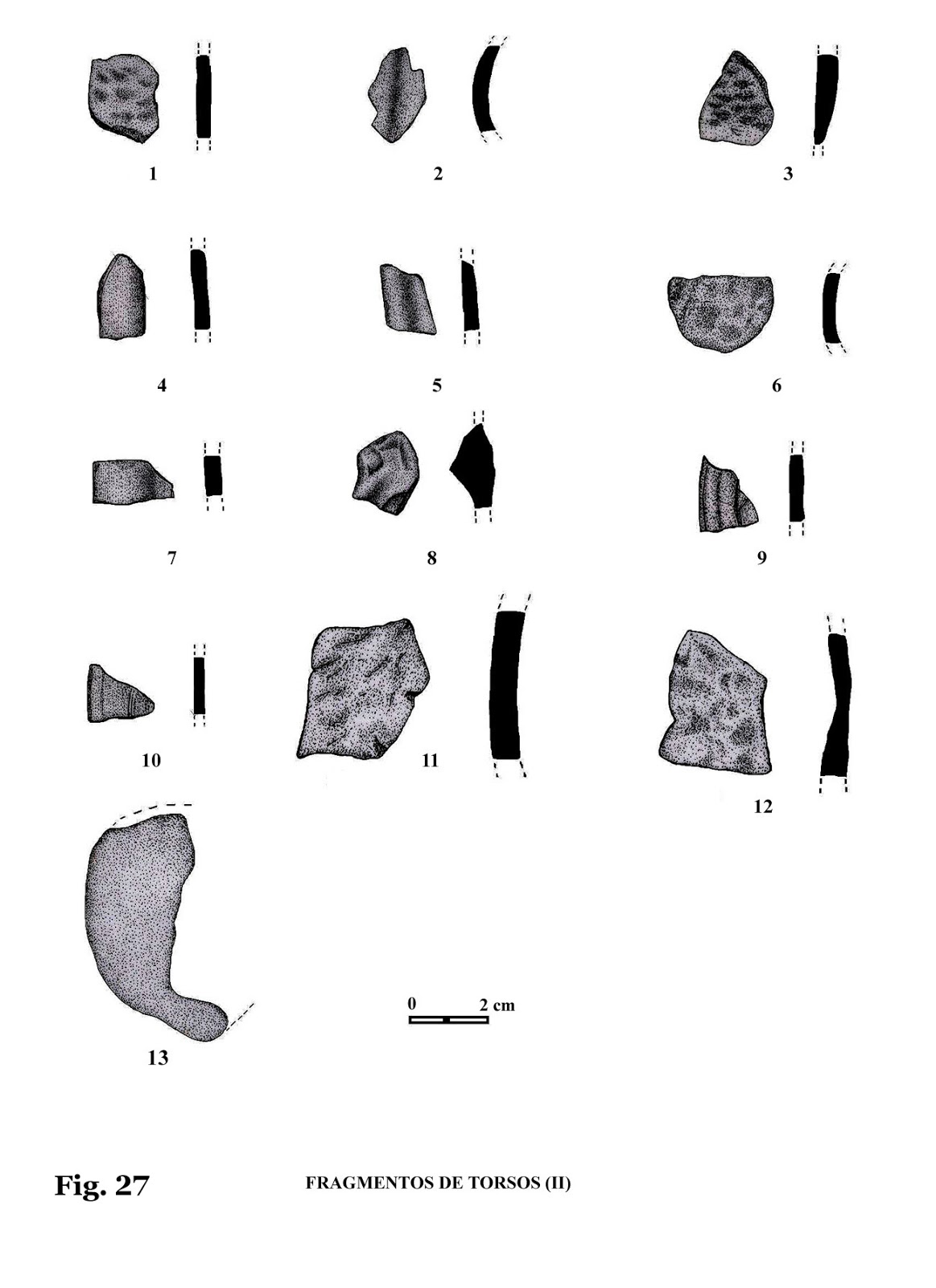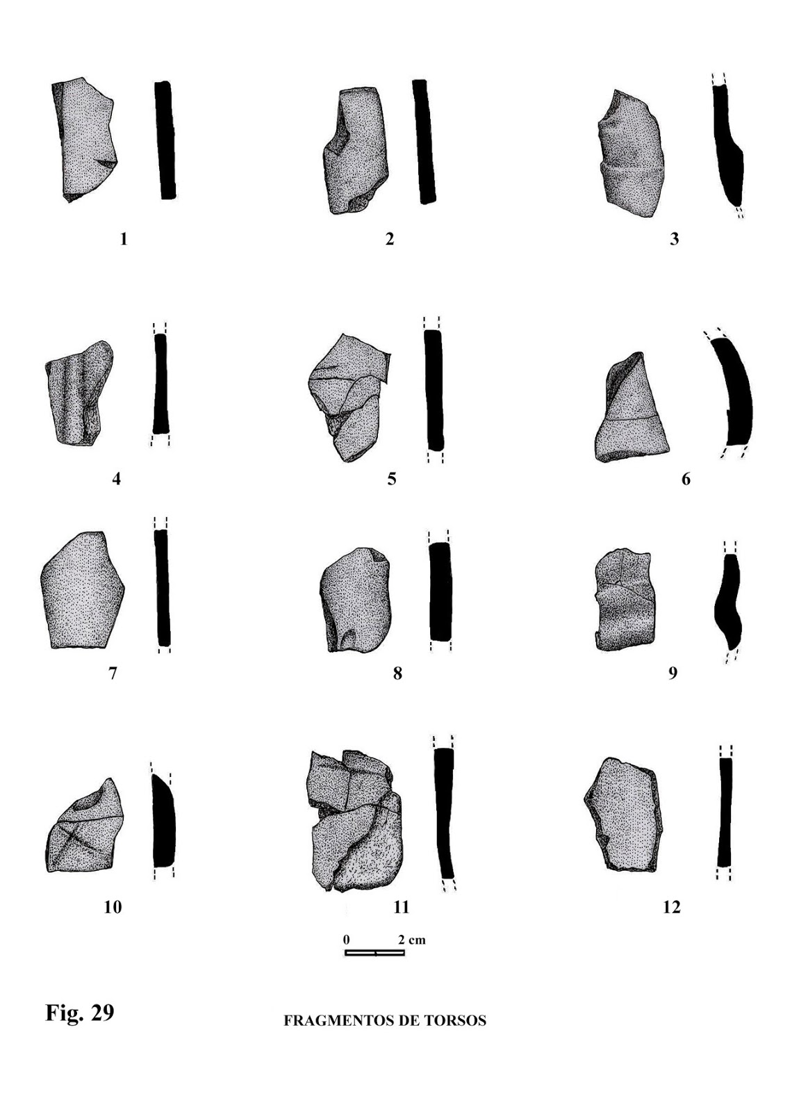 Altura: 3,4 cm. Este fragmento de torso presenta, de forma muy mar-cada, la parte central de un torso, con indicación de un brazo, pero donde no se aprecia la mano por defecto de su estado de conservación.