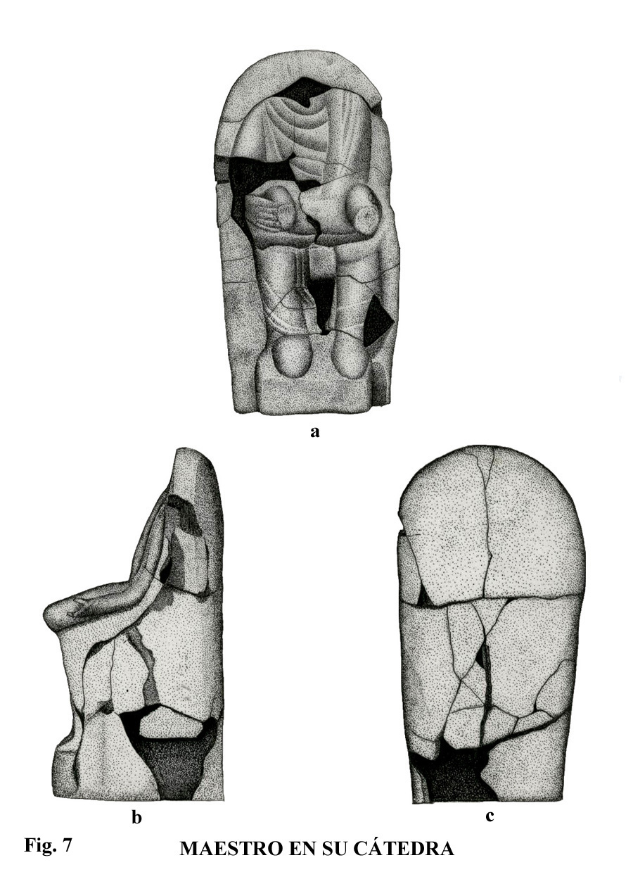 En cuando a la figura del preceptor (fig. 7), maestro en cátedra, tenemos que decir que, lo que hasta ahora se conoce, aparece en un sarcófago, o sea, sobre monumentos funerarios; ejemplo lo tenemos en el museo de Tréveris, donde se aprecian todos los elementos que forman parte de una escena de un maestro con sus alumnos. No tenemos paralelos en figuras de terracota como esta.