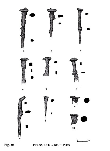 En esta excavación de emergencia se observó, en el espacio del lecho, junto con los huesos, una serie de fragmentos de clavos de hierro muy oxidados, que apuntaban la posibilidad de una caja de madera donde fueran depositadas las terracotas y cadáver. He comprobado sobre el terreno que en esta misma zona han aparecido con bastante frecuencia, en los rebajes de terreno, gran cantidad de estos clavos y muchos residuos de carbón, todo ello en diferentes espacios de las laderas colindantes del enterramiento en cuestión.