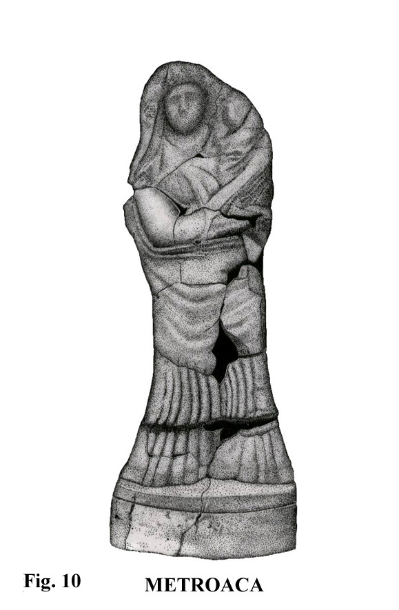 La figura de mujer (fig. 10) crea un estado de opinión variable, según se piense si se trata de una influencia ibérica, como cree García y Bellido, o de una representación divinizada, que la relacionaría con un personaje sagrado, como la metroaca. A este respecto, aparecen figuras en diferentes localidades como Castellar de Santisteban, Porcuna o Alicante. Nosotros pensamos que tan solo es una matrona nodriza romana cumpliendo con el quehacer diario de una casa probablemente señorial.