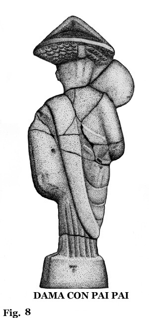 Formas diferentes de peinado se pueden ver en las figuras 8, 9 y 12. La primera, dama con pai pai, muestra un complicado peinado que ocupa la parte central de su cabeza. Hace suponer que toda la parte central del mismo está sujeta por un sistema de varillas que se unen al gorro, observable en sus laterales. La parte delantera tiene forma piramidal, tal como se observa en la figura 9. Parece como si se hubiera utilizado el mismo molde para su ejecución. La primera, 8, es una figura exenta, mientras que la 9 es sedente. Pero en lo relativo al peinado, tocado y gorro tienen una similitud casi paralela.