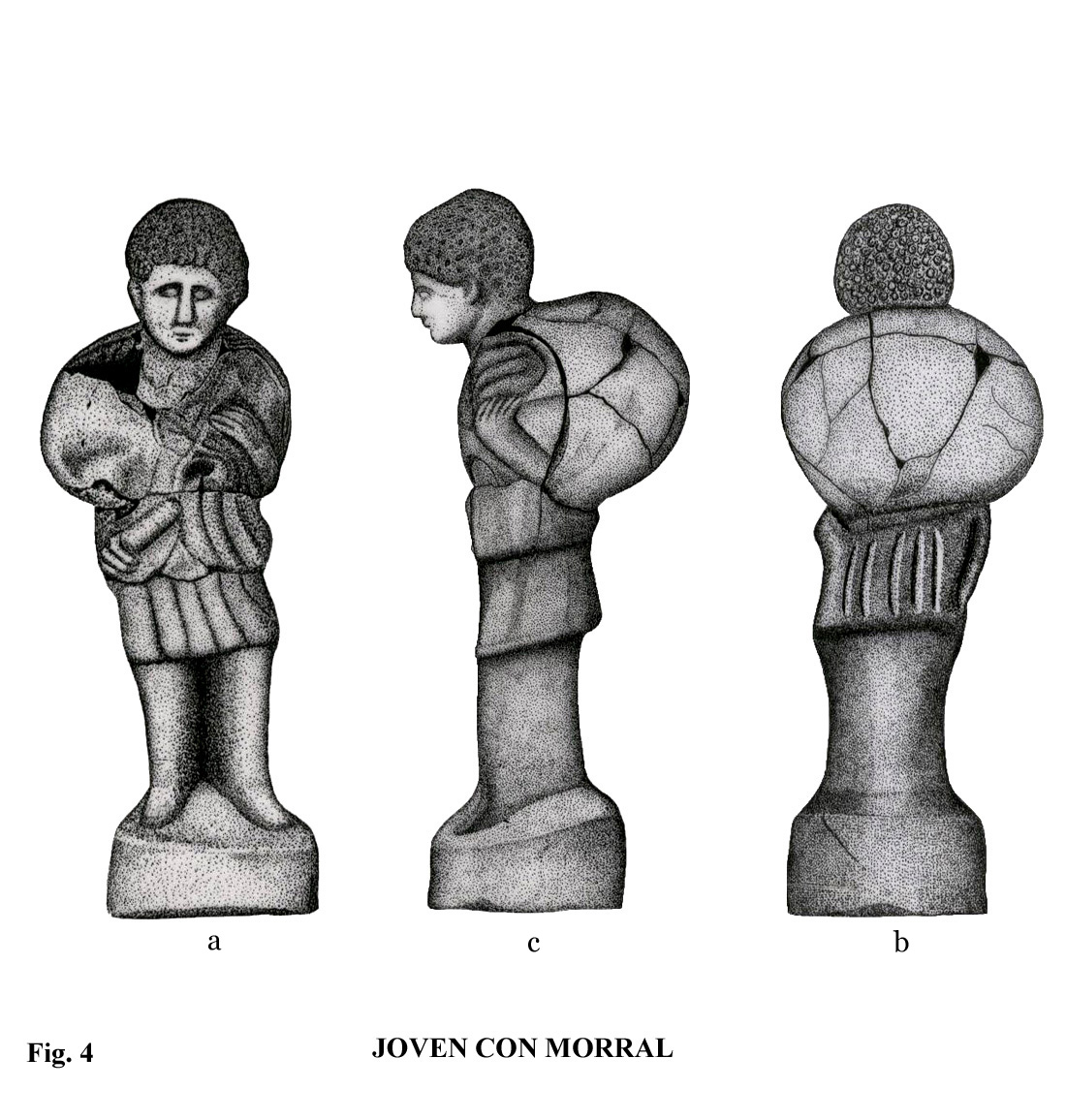 Una figura como la del moscóforo es un hecho muy socorrido en el mundo antiguo, y revela, como la anterior, lo frecuente que era manifestar los episodios rústicos más habituales. La técnica de su ejecución, como se puede ver tanto en el dibujo como en la lámina fotográfica, es de baja calidad (fig. 5). Si se observan los puntos de unión laterales, se ve con claridad que se ha utilizado el procedimiento del doble molde. El uso de la paleta y el punzón se observa bien en los costados, cabeza y espalda.