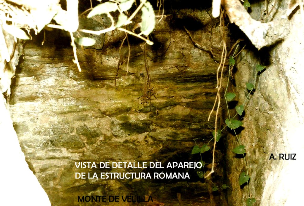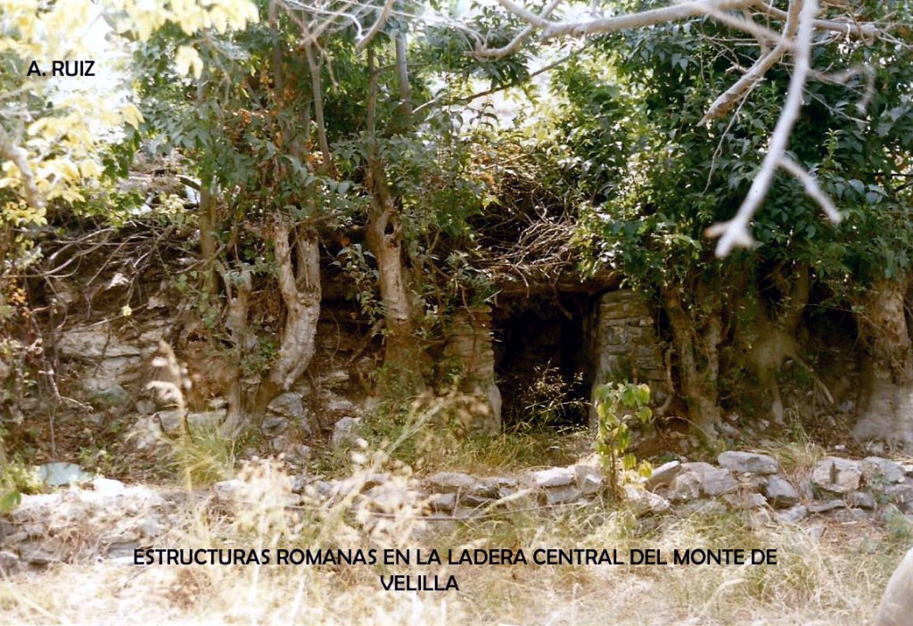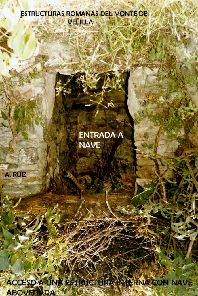 Monte Velilla se encuentra a izquierda de río Verde, según se desciende al mar, casi al final. Subiendo por la ladera nos encontramos con estas estructuras romanas cubiertas por la maleza. En el centro se observan estructuras que debieron ser mayores de lo que encontramos. Esta construcción tiene una entrada dintelada, construida con opvs incertvm y en si interior veremos los muros y sistema interno del yacimiento.