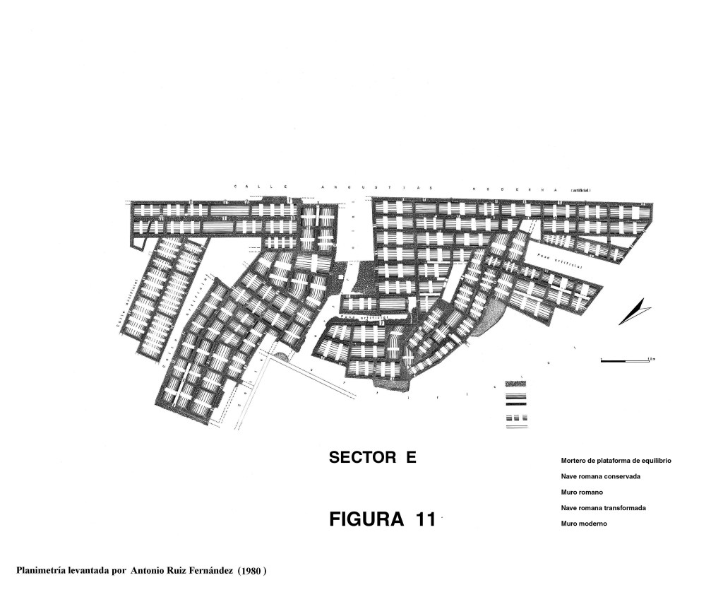 Sector A. Peñón del Santo. Esta zona Fue excavada en 1945 por D. Antonio Fontán. Por los indicios de restos de muros abovedados, debían ser tres o cuatro naves o criptopórticos. Hay restos claros de que los muros de las galerías llegaban hasta el talud, y que debió desprenderse gran parte de las estructuras. Las piletas de salazón debieron estar o a nivel del depósito de agua, o en la parte superior del Peñón, cuya forma no era como hoy se ve. Terminaba en punta y fue allanada por Da. Encarnación Márquez, propietaria de una azucarera de la zona.