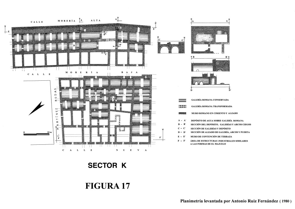 El Sector K, calle Morería Baja, es una de las que muestran también gran número de estructuras romanas tipo galerías, depósitos de agua y probables piletas de salazones. En nuestro trabajo tan sólo se ha podido detectar galerías que siguen un modelo similar a las encontradas en calle Baja del Mar. Lo que puede justificar la presencia de piletas es el depósito de agua que con toda probabilidad estaba destinado a la alimentación de las piletas por estas zonas.