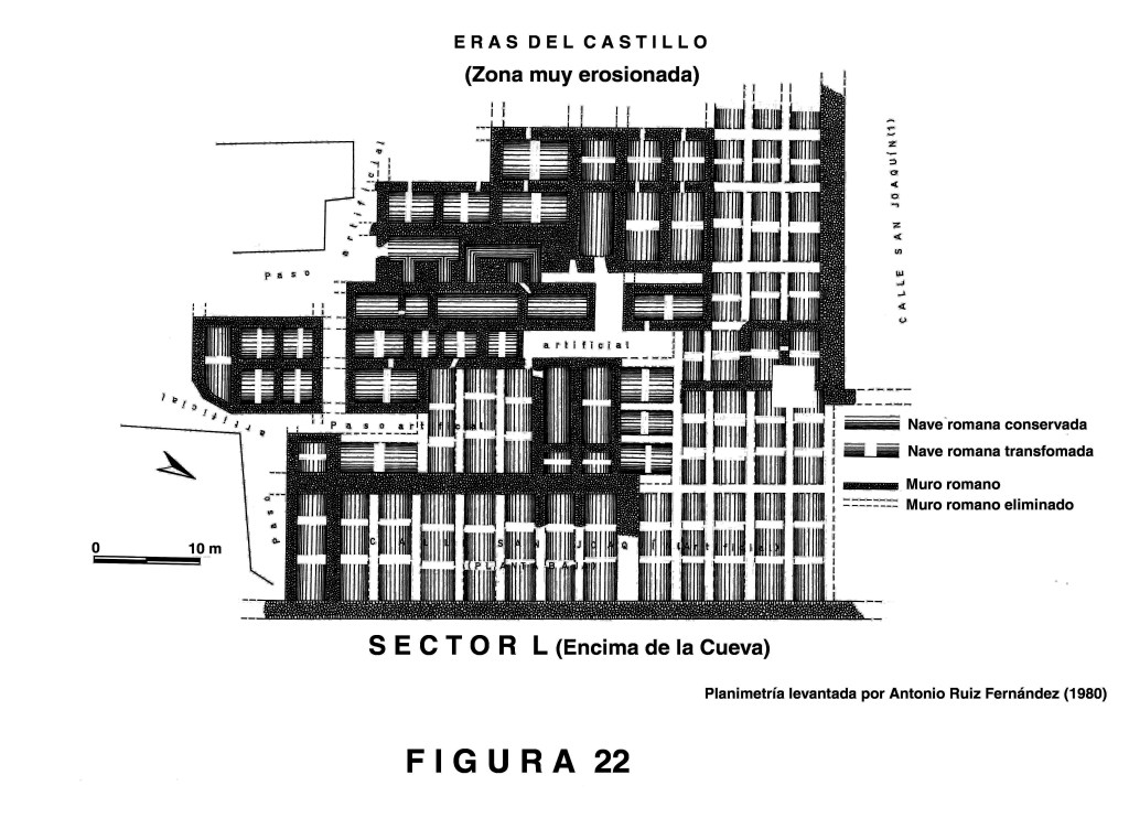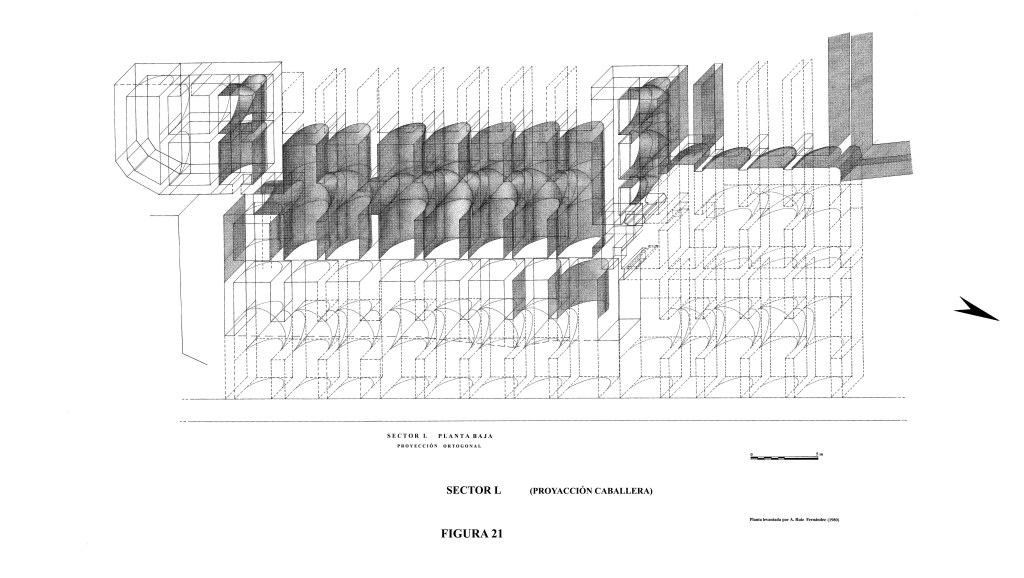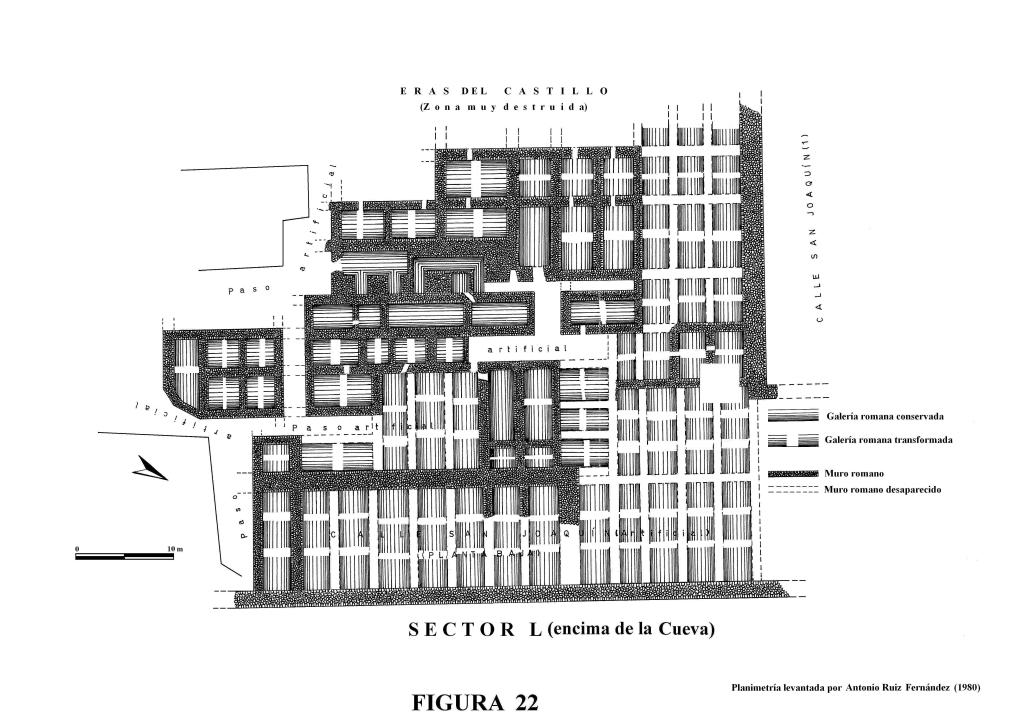 Criptopórtico Cueva de Siete Palacios. Fase de excavación. Sector L. Está compuesto este elemento de una nave central y siete colaterales, con prolongaciones, en su orientación, hacia Poniente y Levante, contándose su continuidad en ambos sentidos, o sea, las estructuras de naves abovedadas continuaban hasta que fueron destruidas para abrir paso.