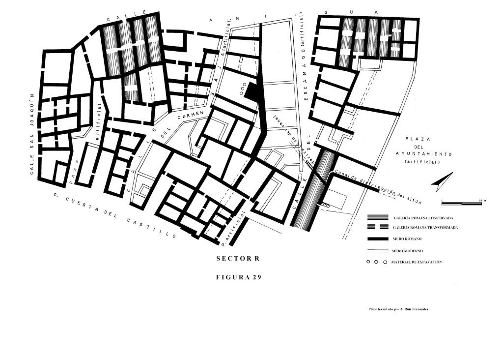 El Sector M. El tramo final de la calle Antigua está muy ligado el Sector F. Apenas se entra en la calle San Miguel, a izquierda, tenemos la continuidad de las series de criptopórticos que van a configurar la mayor parte del casquete superior de la ciudad. En este plano reflejamos principalmente lo que son las redes de galerías, no los restos de otros elementos romanos que se hayan en su trazado.