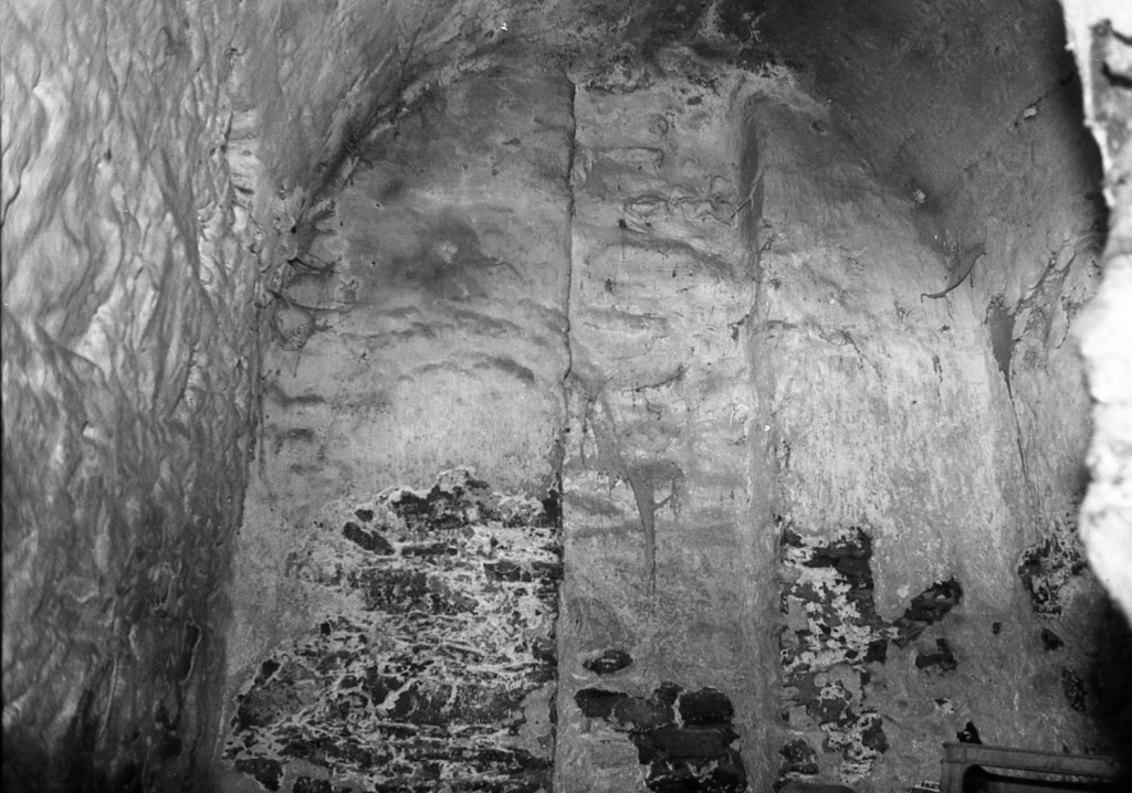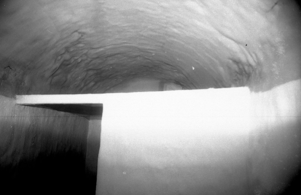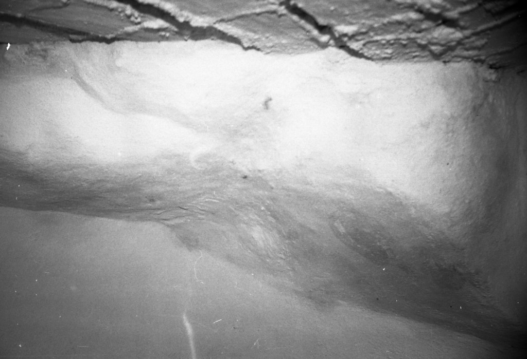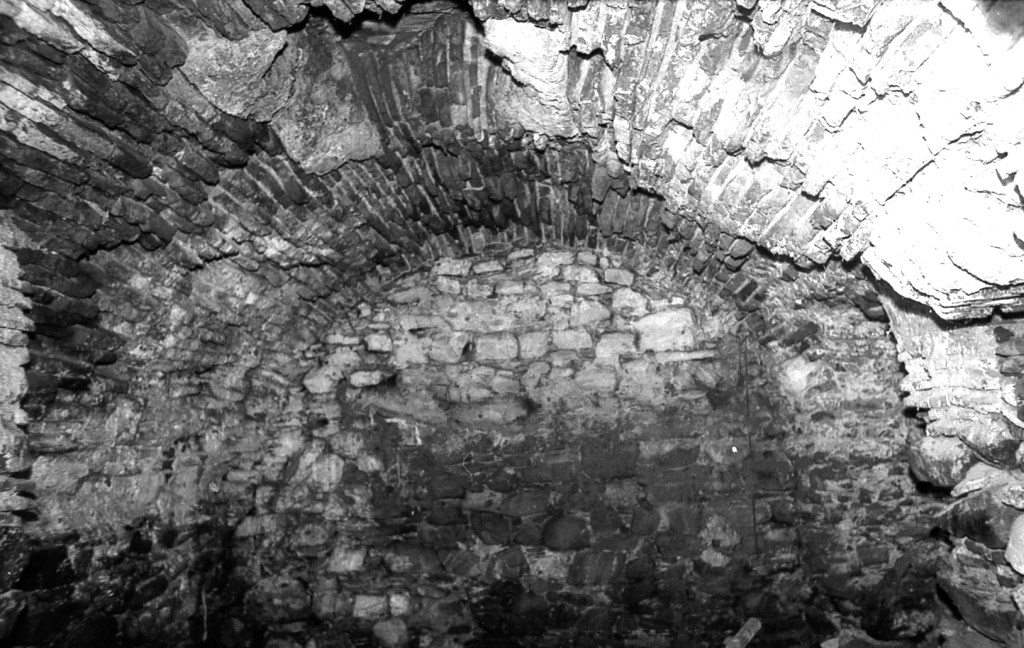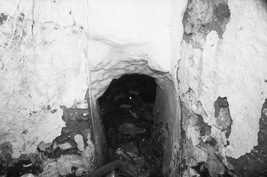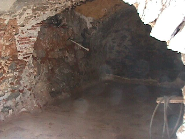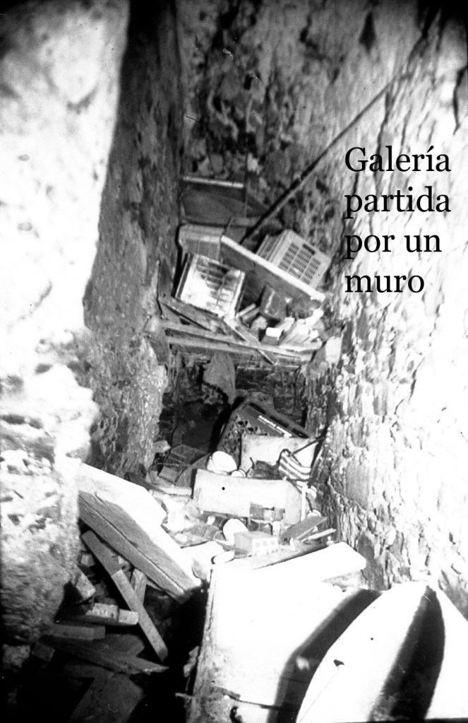 La misma galería anterior, vista desde el punto opuesto. Aquí se aprecia que había una salida hacia otro espacio, probablemente galería también, y cuya puerta de acceso se encuentra taponada por obra moderna. En esta foto se aprecia, en algunos espacios, la impronta del maderamen usado para el levantamiento de la bóveda, tal como ocurre en Espaldas de San Miguel, donde se aprecia con toda claridad esta señal constructiva.
