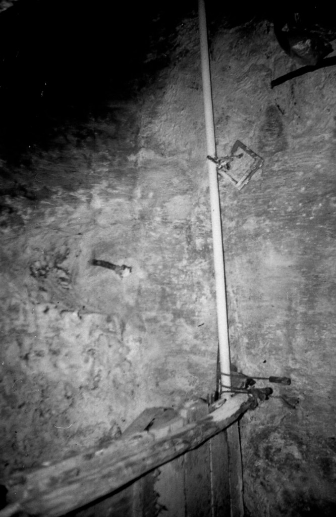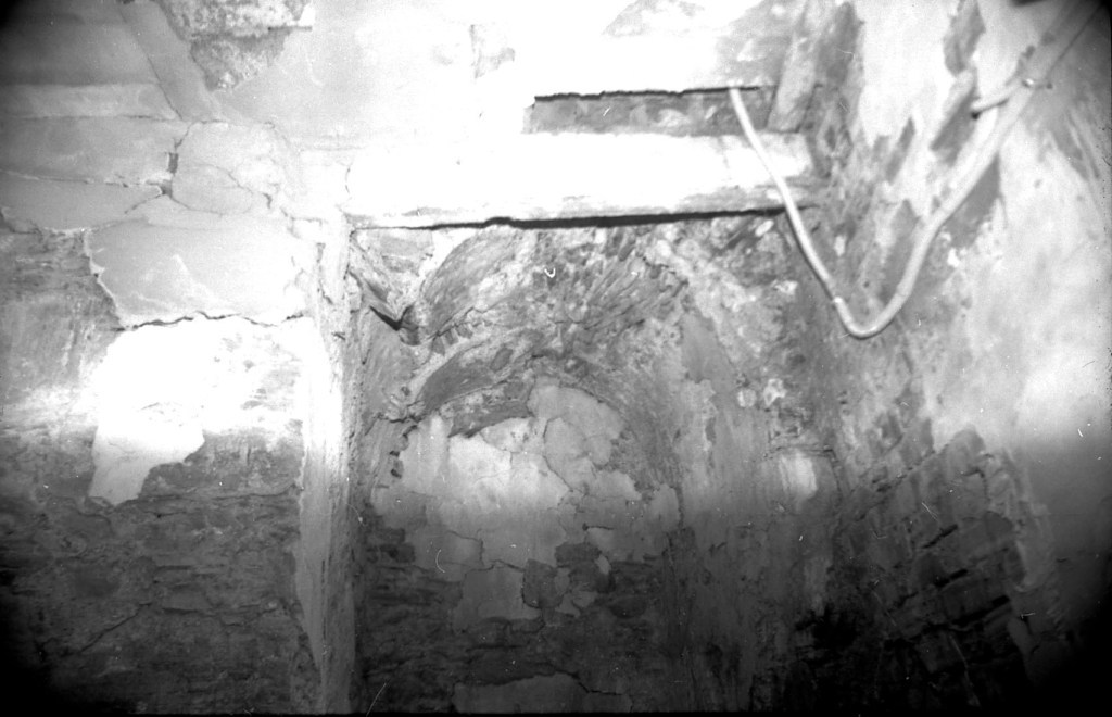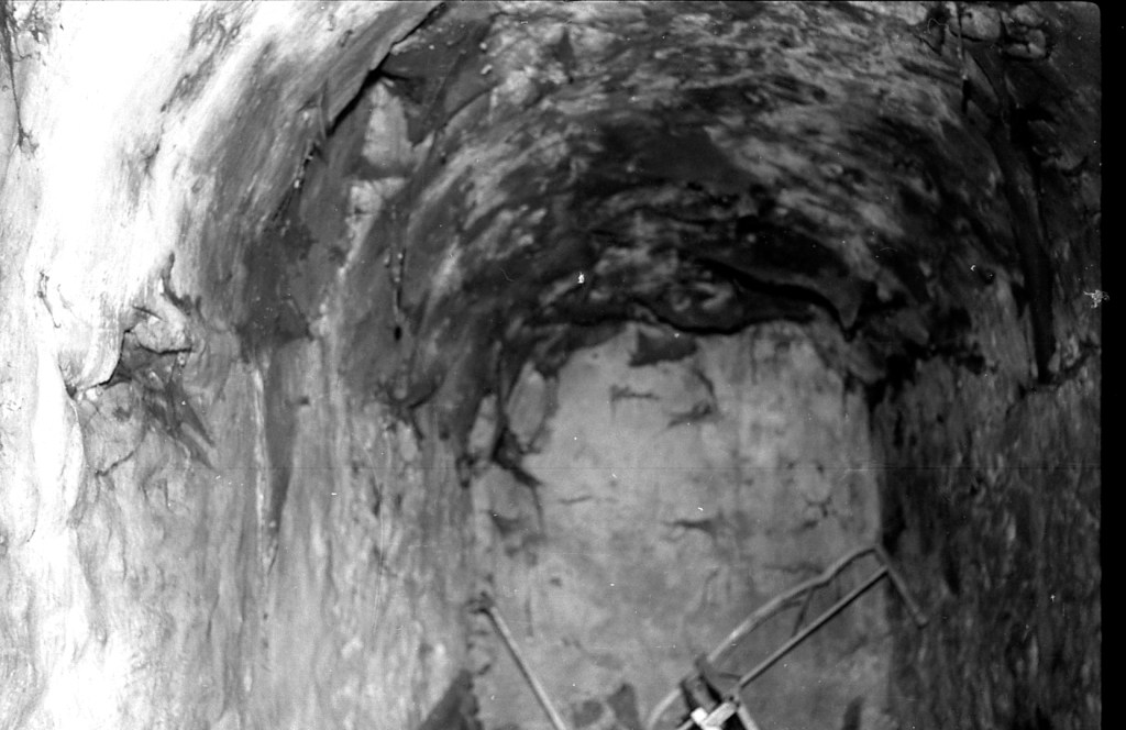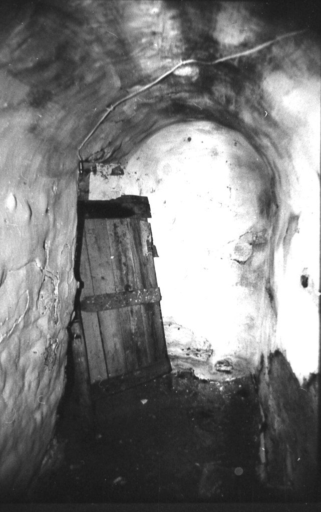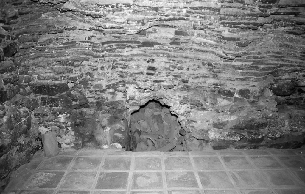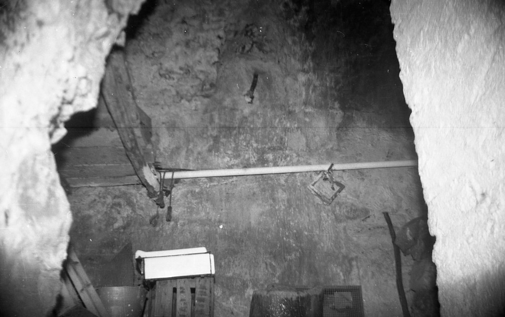 La misma galería anterior, vista desde el punto opuesto. Aquí se aprecia que había una salida hacia otro espacio, probablemente galería también, y cuya puerta de acceso se encuentra taponada por obra moderna. En esta foto se aprecia, en algunos espacios, la impronta del maderamen usado para el levantamiento de la bóveda, tal como ocurre en Espaldas de San Miguel, donde se aprecia con toda claridad esta señal constructiva.