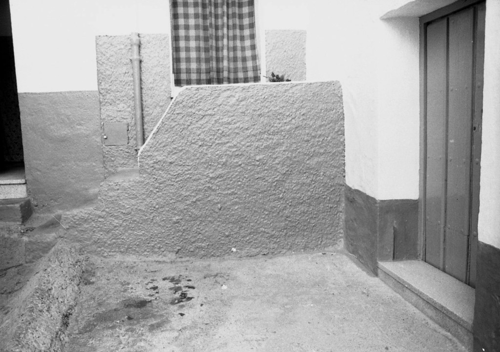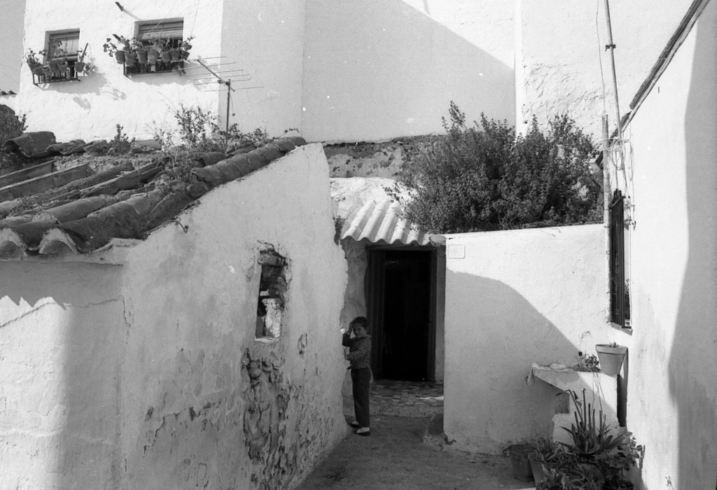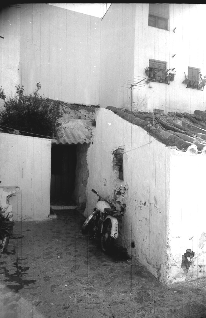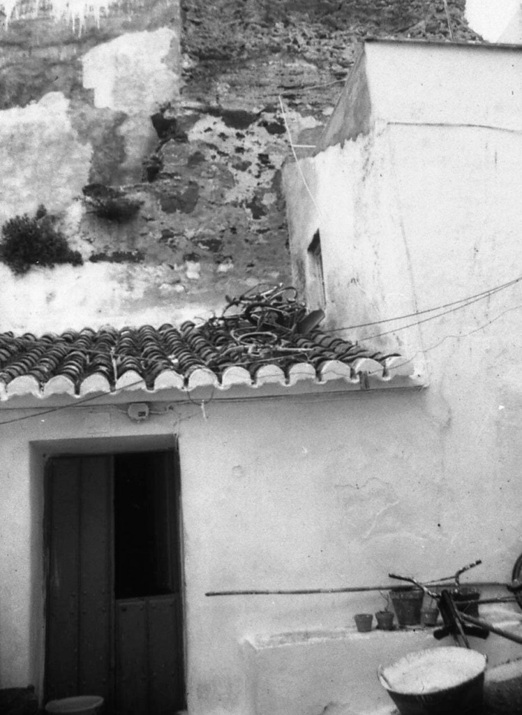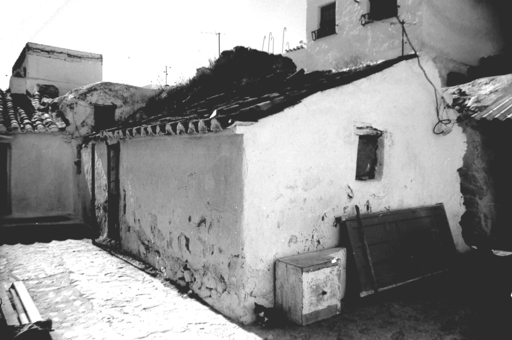 En esta foto se muestra el espacio doméstico que se repita a través del resto de la calle Morería alta. Al fondo de la imagen se ve lo que sigue siendo una muralla que discurre como elemento de apoyo de la zona superior, o calle Antigua. Y este espacio es una adaptación de las galerías que aquí se encontraban tiempos atrás.