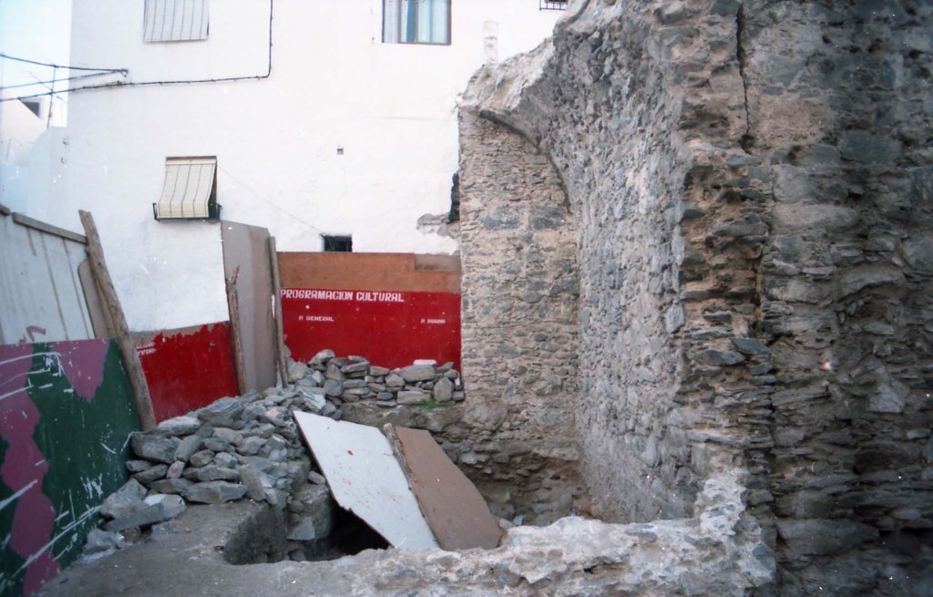 Calle San Joaquín III. Emplazamiento de una galería que comparte espacio por medio de un muro divisorio con otra galería del Sector F. En la foto se observa el hueco de entrada a la citada galería, y en el alzado se ve parte del llamado torreón, que probablemente lo fue. Hoy día ha desaparecido por ciertas negligencias municipales.