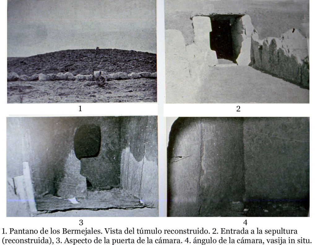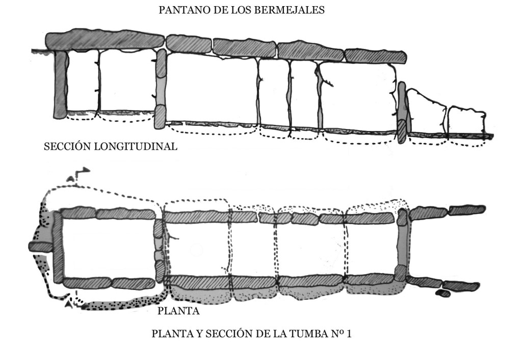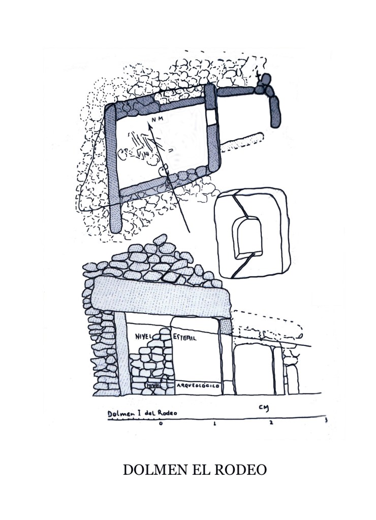 NECRÓPOLIS LA CAMARILLA MEGALÍTICA DE MONTEFRÍO. Características de las tumbas: cámara trapezoidal, con corredor corto y trapezoidal; paredes de losas ortostáticas alternantes con mampostería desnuda.; acceso con puertas abiertas en los ortostatos; decoración con salientes tallados.