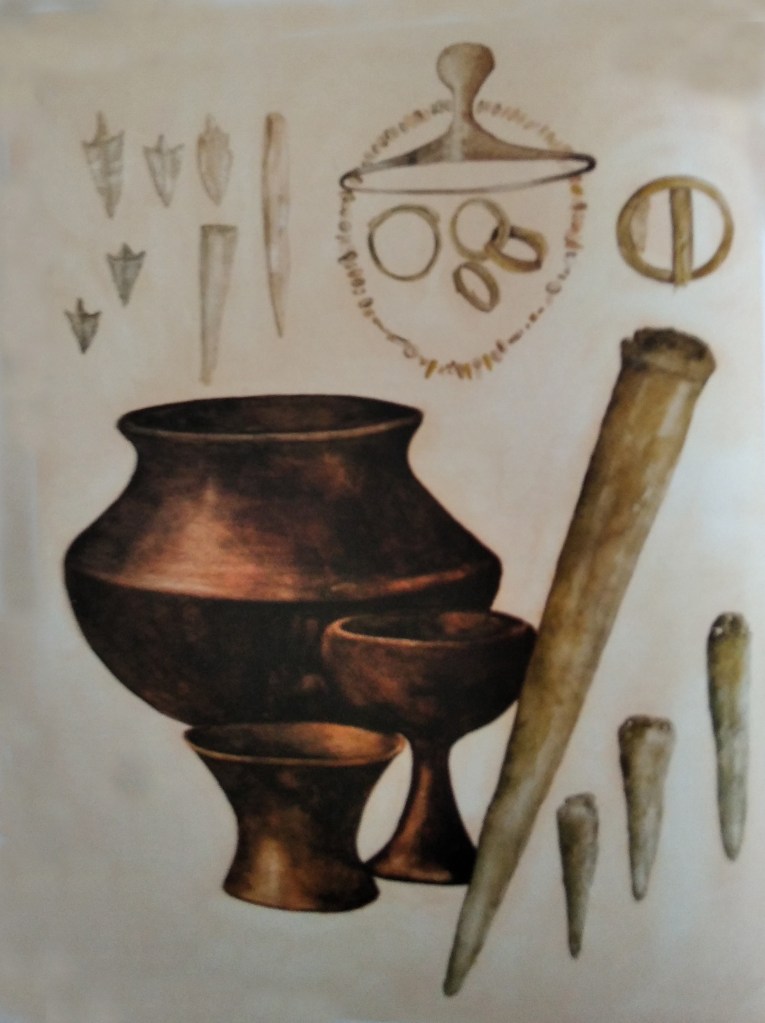 - Tecnología: invención de la cerámica, útiles de piedra pulimentada, instrumentos agrícolas: molino de mano, hoces.