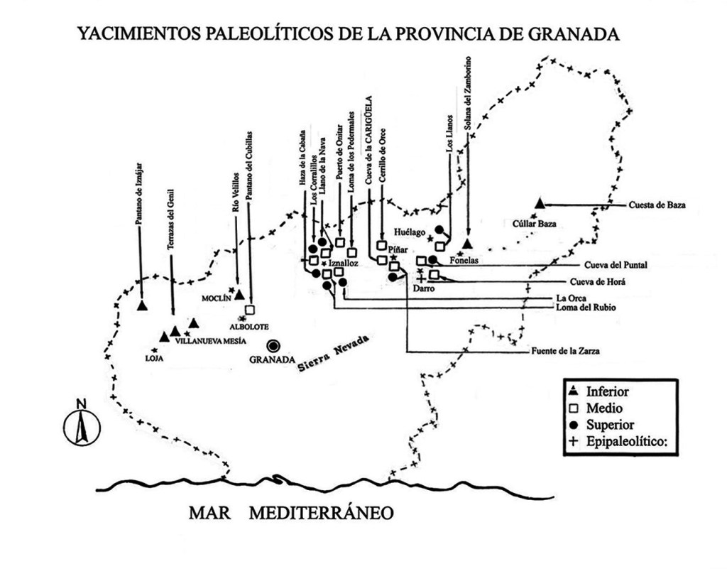 Iniciamos el trabajo con un plano general de la provincia de Granada y su periferia, para mostrar la red de yacimientos de las distintas etapas de paleolítico en este espacio arqueológico, marcando las diferentes zonas con la denominación de los respectivos emplazamientos.