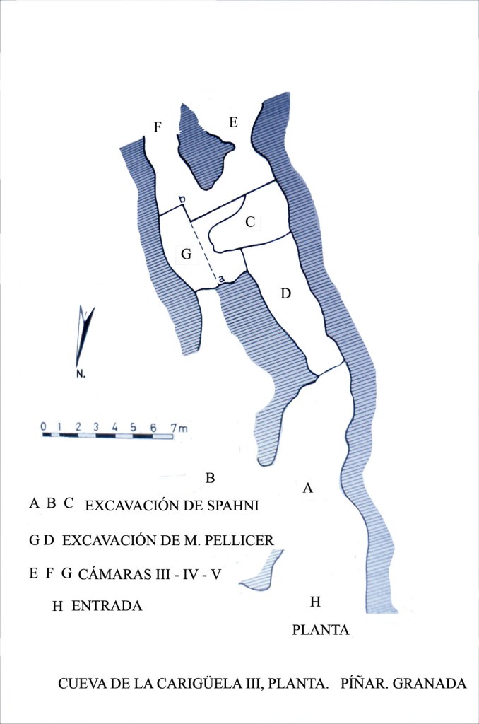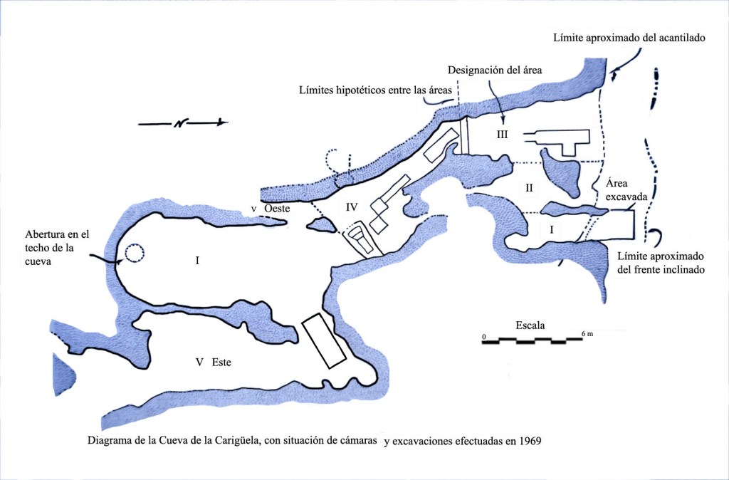 LA CARIGÜELA: Fue excavada inicialmente por Spahni. Sus resultados están aún inéditos. Tiene depósitos de más de cinco metros de potencia, con estratos neolíticos y del Bronce (investigados por Pellicer). El estudio ha sido tan rico en materiales que un metro cúbico ha dado entre 400 y 500 útiles, y 50.000 lascas de piedra tallada y un incalculable número de huesos de animales.