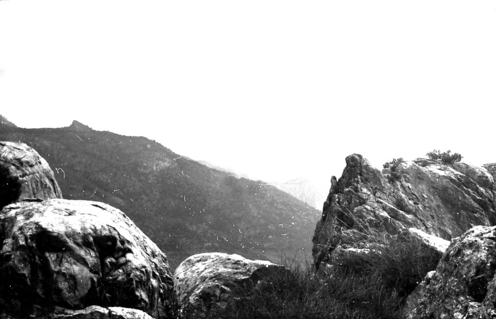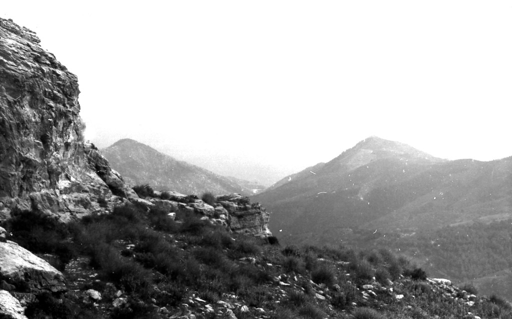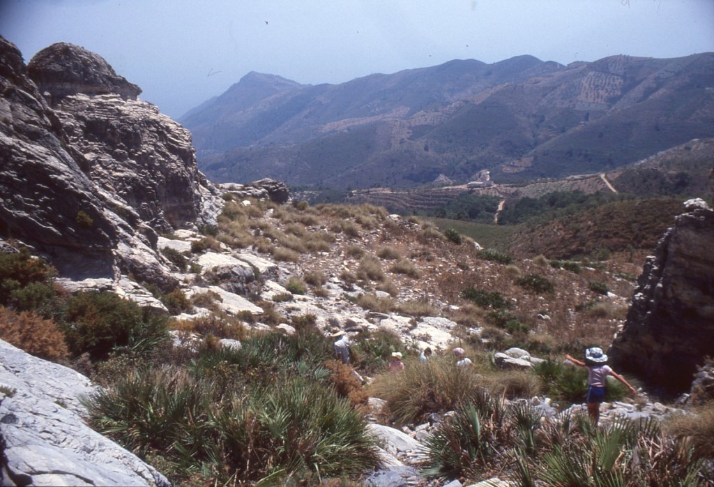 Foto 5.-Desde las faldas de las grandes rocas que conforman este complejo fortín natural, se observa la parte de Poniente que se dirige hacia la playa y mar, terreno prácticamente ya de la provincia de Málaga. Esta parte debió estar ocupada por grupos adelantados de defensores y con medios para establecer un sistema defensivo a base de murallas y torreones. Como se ha dicho al principio, por estos lugares no existían veredas ni caminos: todo se recorría a través del campo.
