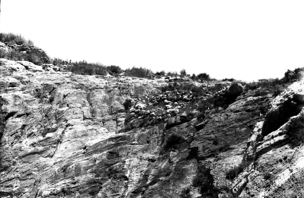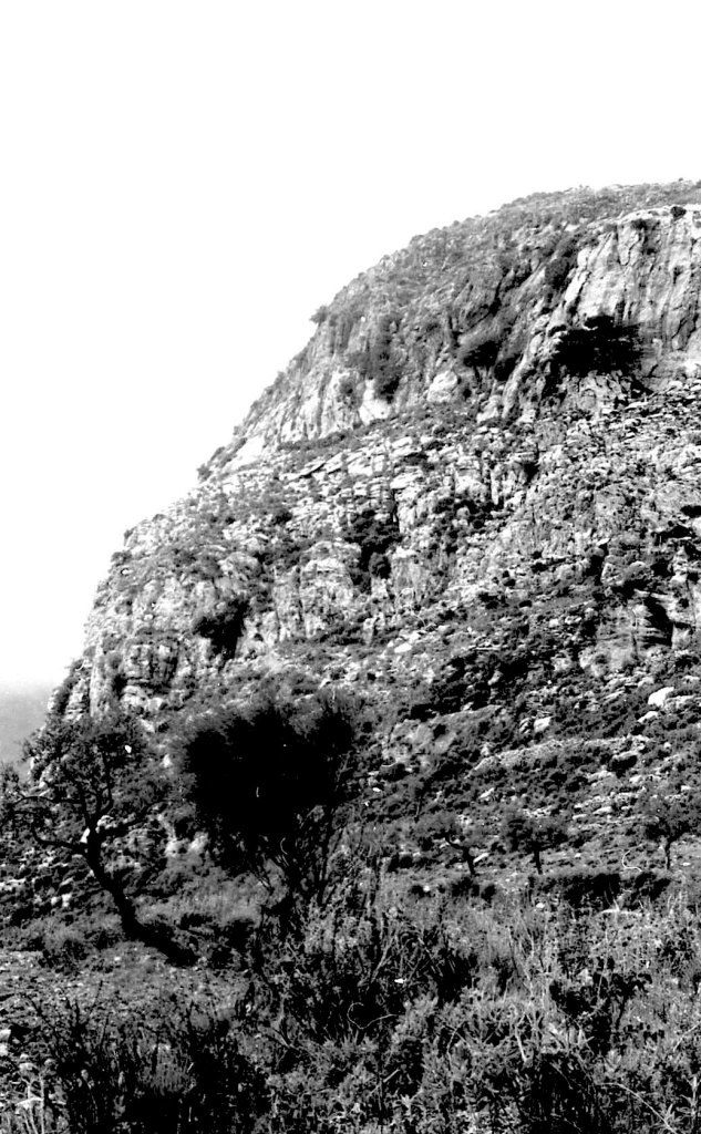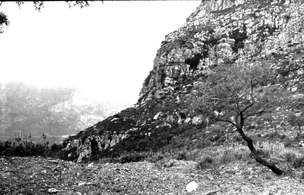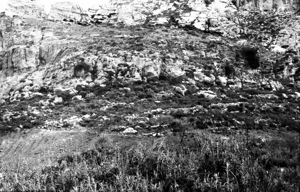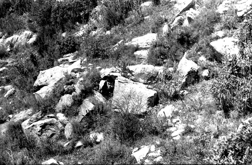 Foto 15.- Vista de detalle de una parte del risco donde se encontraba la necrópolis. Se puede observar que la vegetación era propia del tipo mediterráneo. Además se observan rocas caídas probablemente por la erosión.