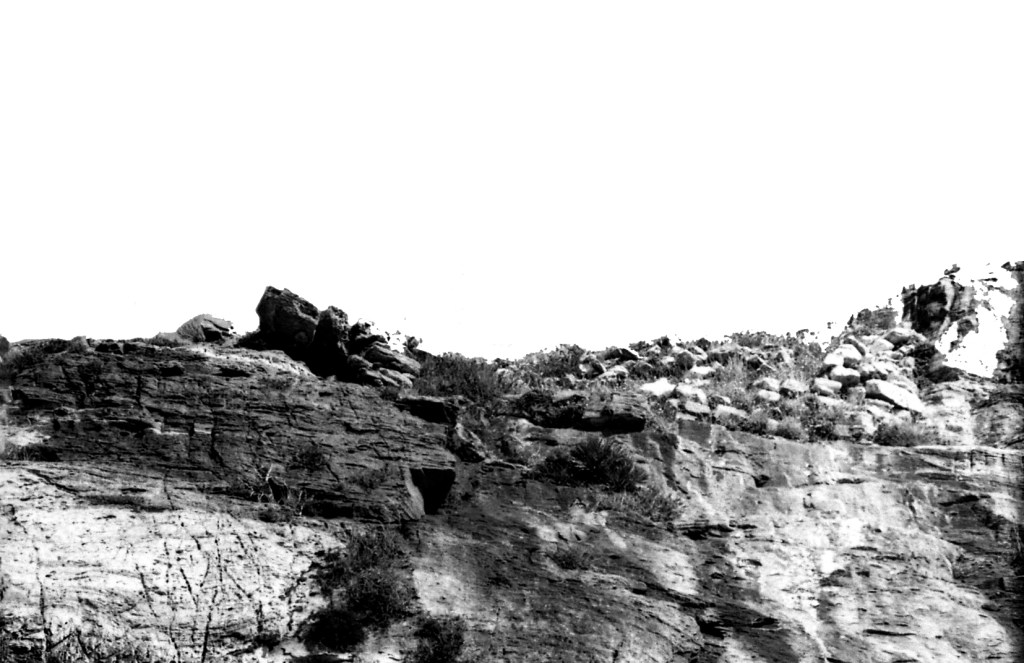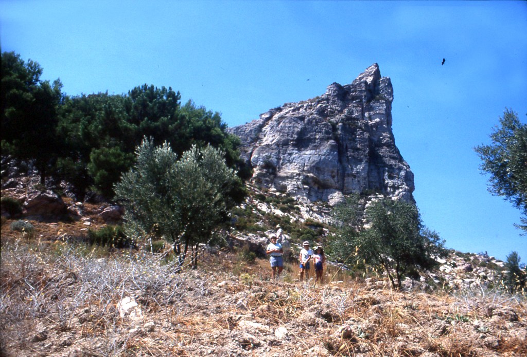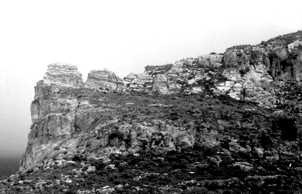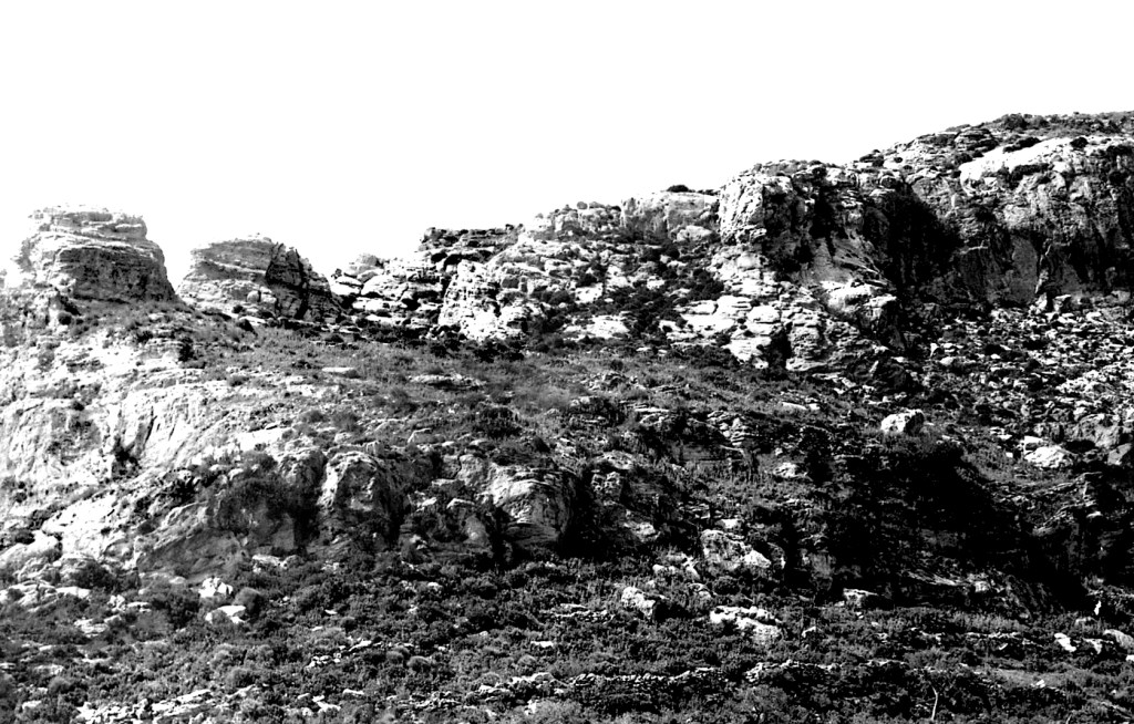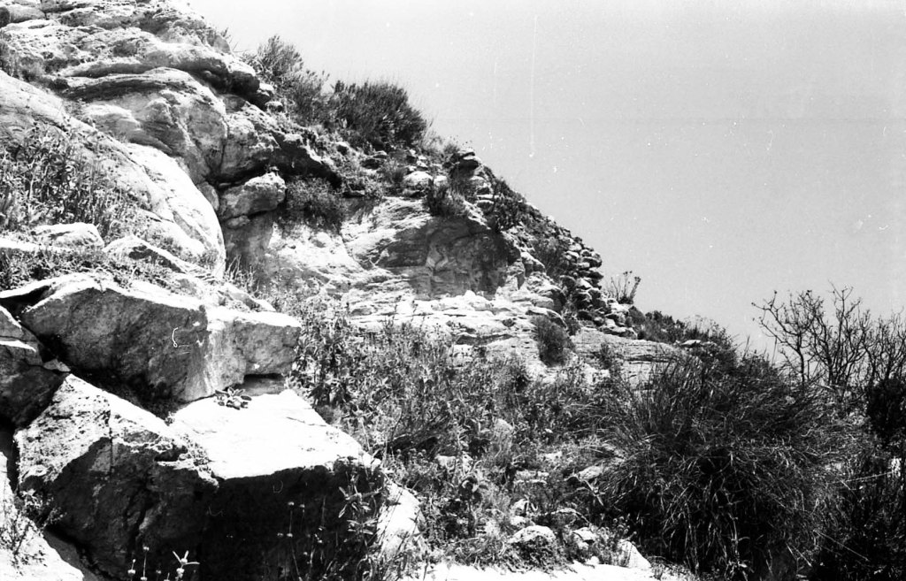 Foto 15.- Vista de detalle de una parte del risco donde se encontraba la necrópolis. Se puede observar que la vegetación era propia del tipo mediterráneo. Además se observan rocas caídas probablemente por la erosión.