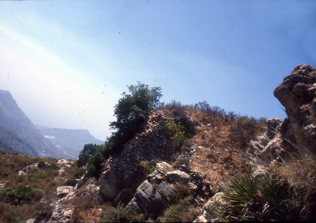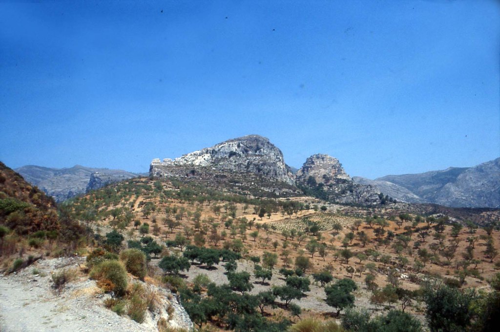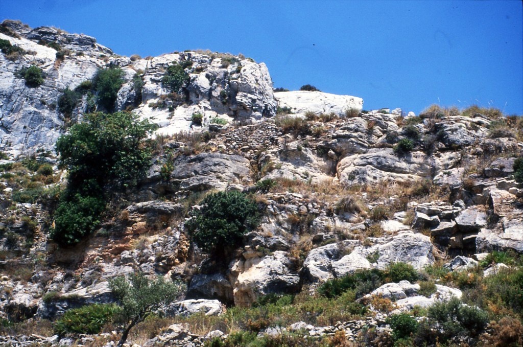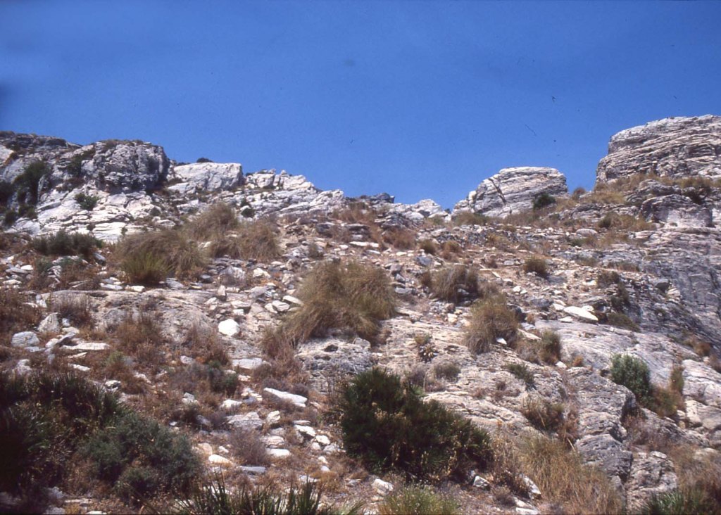 Foto 13.- En esta imagen se muestra un terreno algo más apropiado para el establecimiento humano, pero, como se verá más adelante, aparecen restos de estructuras que pueden pertenecer a algunas formas defensivas del emplazamiento. En la parte superior izquierda se puede ver una abertura en forma de «V», que, al parecer, fue la parte de este solar destinado al emplazamiento de una necrópolis. Pude contemplar las tumbas árabes, pero me ha sido imposible hasta ahora encontrar los negativos. Posteriormente se ha visitado ese lugar y no han aparecido ni una sola laja de las sepulturas. Han removido todo buscando algo de valor y lo han dispersado todo. Pero, insisto, las tumbas estaban en su sitio y bien marcadas. El pillaje ha acabado con ellas. En general, se ignora que el mundo árabe no enterraba objetos de valor en sus enterramientos. y… he visto muchos en otros lugares de la comarca de Almuñécar.