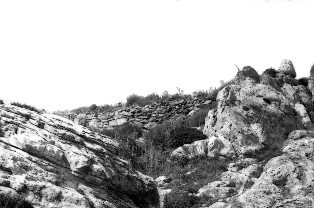 Foto 43.- A continuación de la cresta anterior se puede observar con claridad la existencia de muros al parecer levantados con argamasa de cal y arena de río. Comienza lo que se puede considerar la acrópolis del recinto militar.