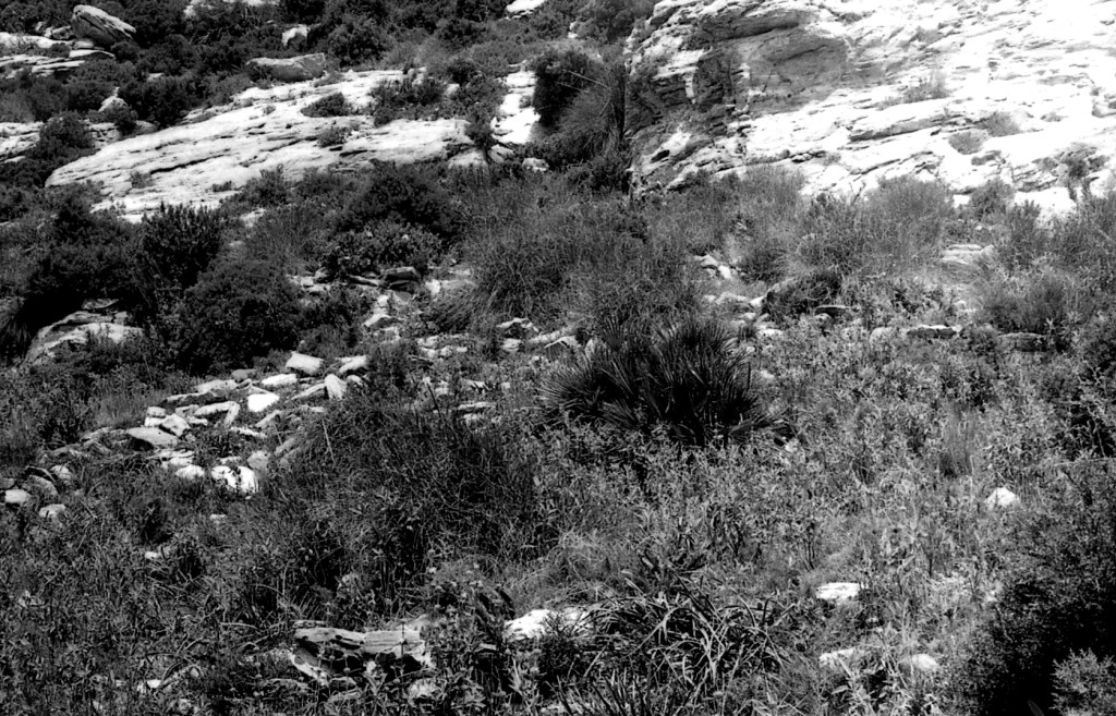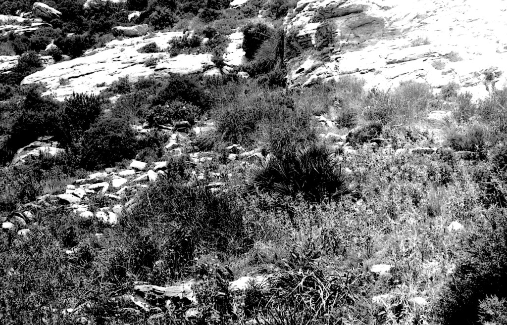 Foto 50.- En el centro de esta imagen podemos ver bien un muro de contención que servirá para ir dando uniformidad a los pasillos inmediatos y poderse mover en esas alturas. Ocupa una vaguada pequeña y evita la erosión hacia las partes bajas. Téngase en cuenta que estamos describiendo las crestas de esta cadena de fortines y torreones como se verán más adelante.
