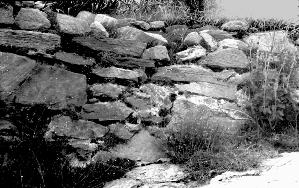 Fot. 37.- Tomando una foto de detalle de unos de esos muros, se puede ver que algunos conservan restos de argamasa por zonas. Era una técnica muy habitual en estas alturas. Los romanos tienen una villa rústica cerca de este lugar y usaban el mismo material de construcción aunque con una técnica más refinada tanto en la forma de las piedras como en la argamasa interior. Esas construcciones se llaman «Los Bañuelos».