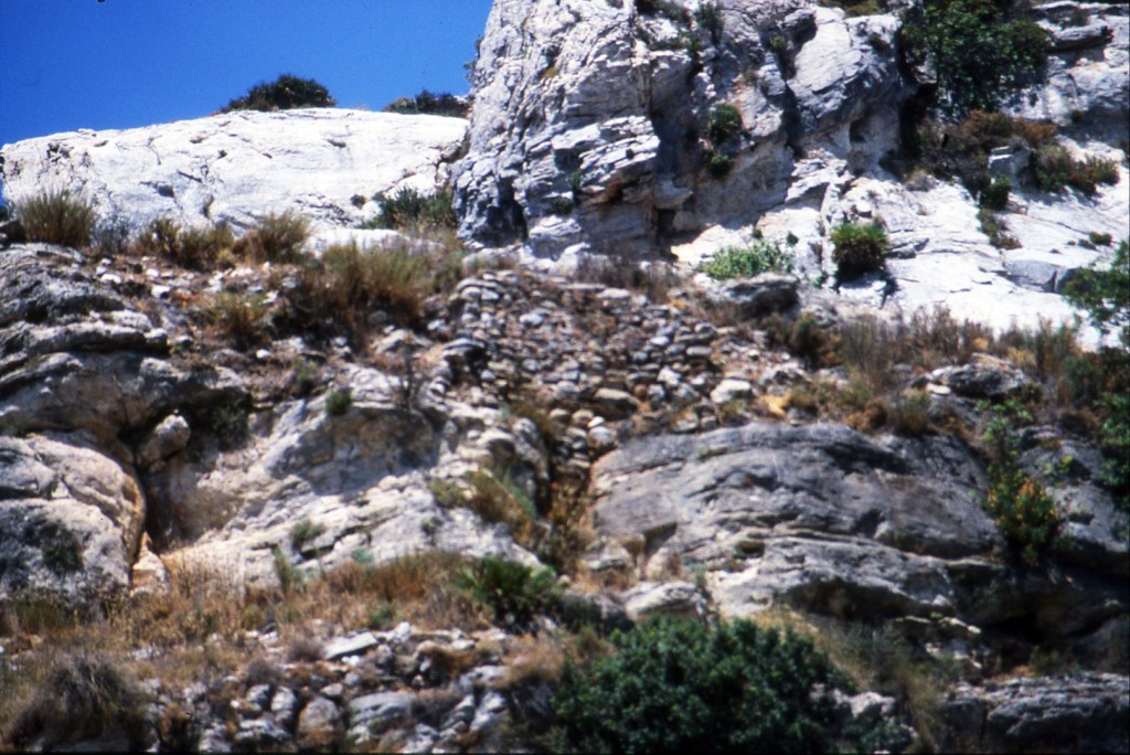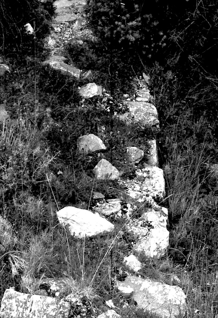Foto 25.- Punto de la cima donde empiezan a utilizarse refuerzos con piedras para evitar la erosión. Como se sabe, este lugar fue ocupado por los árabes varios siglos, iniciándose sobre el IX de n. e.