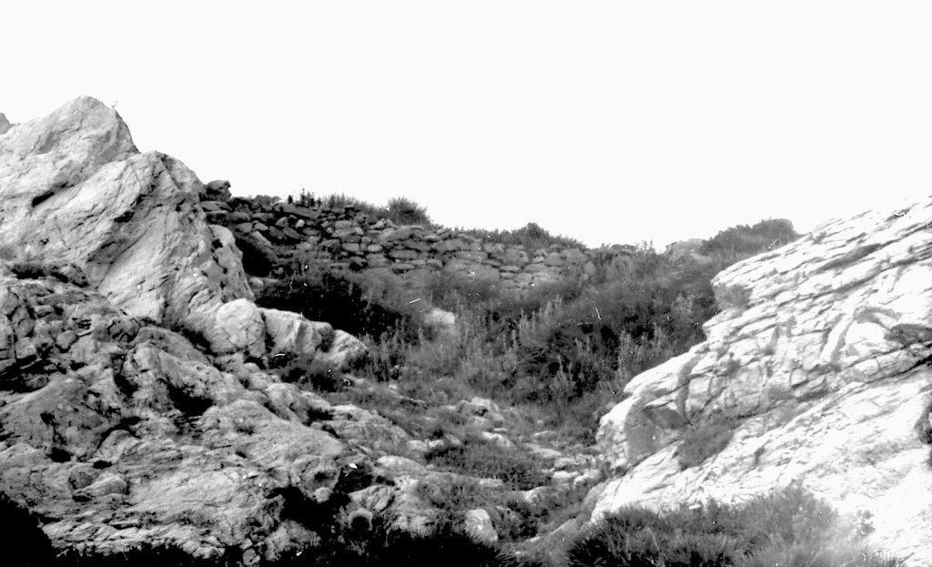 Fot. 34.- Detalle de la toma anterior para hacer ver cuándo se utiliza argamasa y cuando no. A primera vista parece una construcción ciclópea, las piedras no llevan argamasa; sí están bien encajadas. De entrada parecen muros de circunvalación del recinto, pero podrían ser elementos de tipo doméstico. Sólo una excavación despejaría esta incógnita. Pero quien pudo hacerlo, no se atrevió más que a mirar y escribir cuatro frases descriptivas sin más comentario.