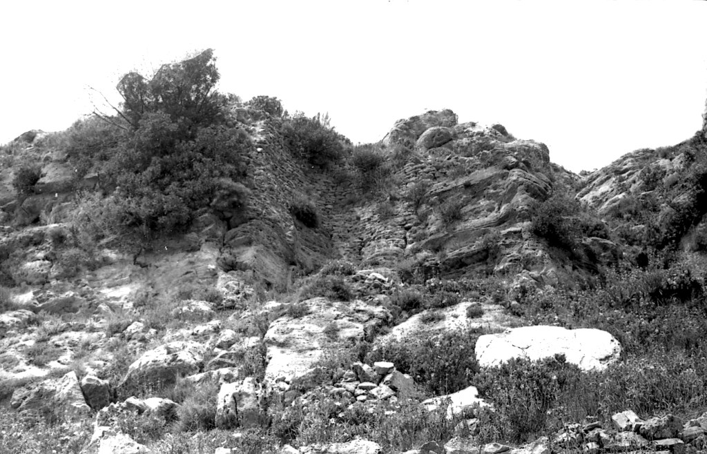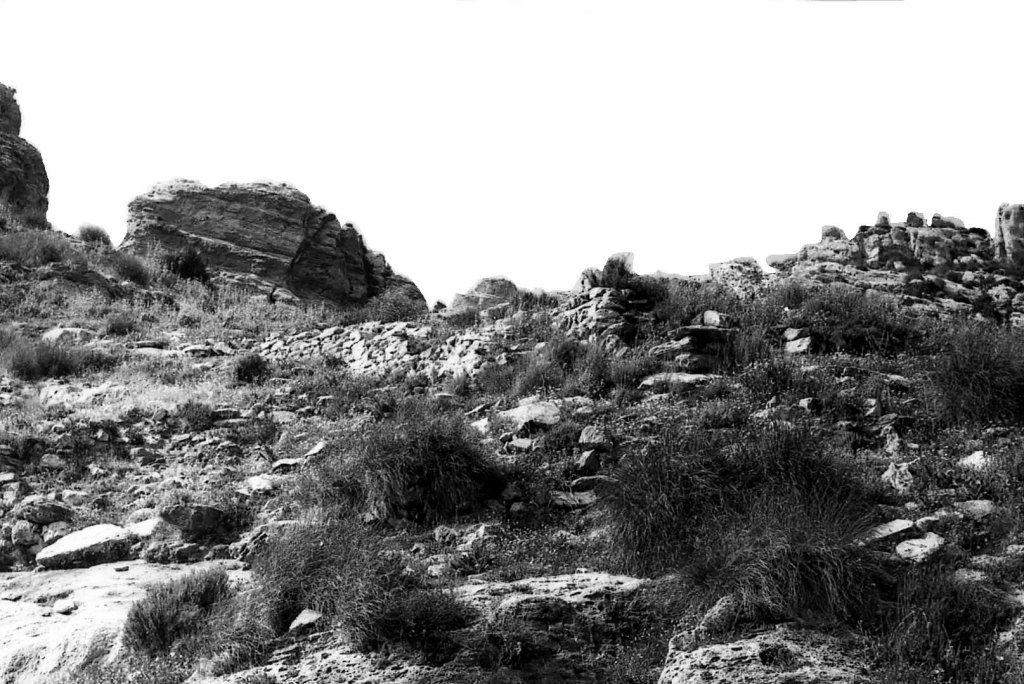 Foto 40.- En la falda de la zona oeste de esta primera cadena de picos es donde empiezan a aparecer los sistemas escalonados de las estructuras domésticas. Los muros se notan con cierta claridad, pero bastante disminuidos de altura, debido a lo que antes se ha comentado sobre el uso de materiales árabes para otras construcciones más modernas.