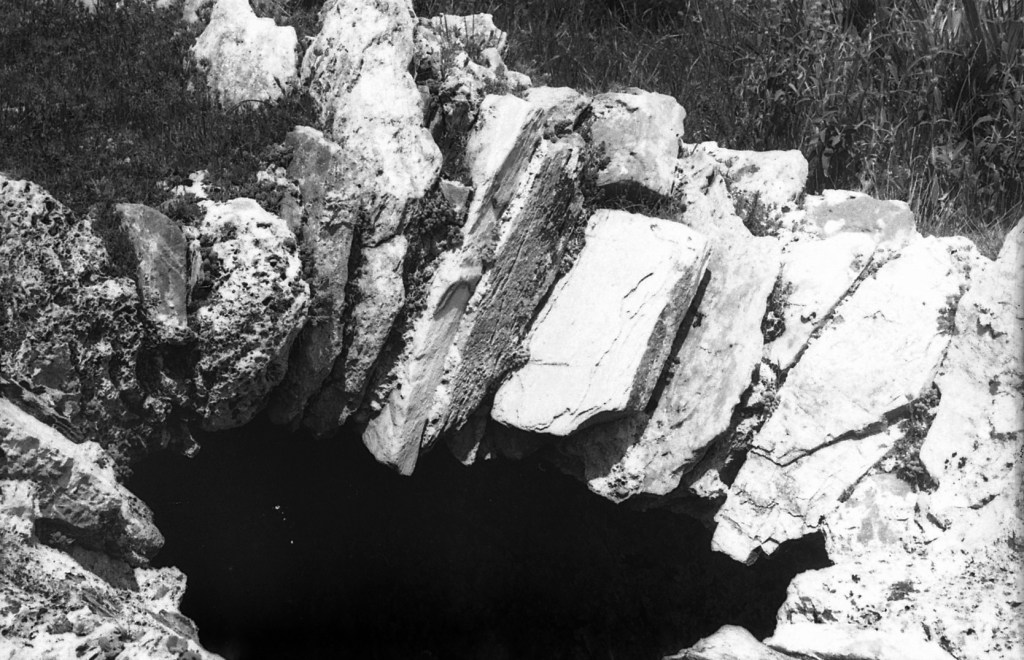 Foto 68.- Cubierta exterior del aljibe primero. Es de roca resistente, pero se nota que ha sido retocado posteriormente. En la parte de arriba de la imagen se ve que han abierto un agujero para el acceso, aunque pensamos que, para la extracción del agua, habría que hacerlo por la cubierta, porque por lo que se podría considerar su entrada natural, provocaría gran perdida de agua. Por tanto, el agua había que sacarla o con polea, o con utensilio tipo cubo.