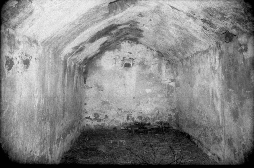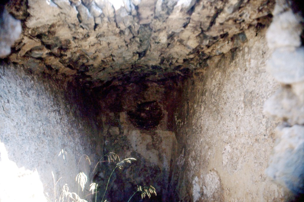 Foto 67.-(SELAMBINA). Interior del aljibe de Salobreña. Su forma es diferente: cubierta triangular y material impermeabilizante de similares características al de los Castillejos; pero su alzado utiliza materiales de inferior calidad. Su proporciones son similares a las del segundo aljibe de los Castillejos de Almuñécar. También se nota que ha sido reutilizado, en este caso, para guardar animales.