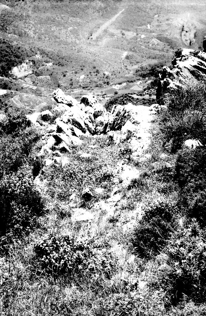 Foto 8.- En esta imagen destacamos la defensa natural que tiene esta plaza militar. Es un tajo muy escarpado y sin foresta necesaria para poder acceder a la parte del poblado. No obstante suponemos que toda esta falda de monte que da al Oeste y de inmediato al Norte, estaría destinada a la agricultura para la supervivencia de la población aquí establecida. Por las condiciones naturales sería un terreno cultivable en la modalidad de secano, puesto que hasta este punto tan sólo se podía recoger agua de lluvia que sólo se podría destinar al consumo humano.