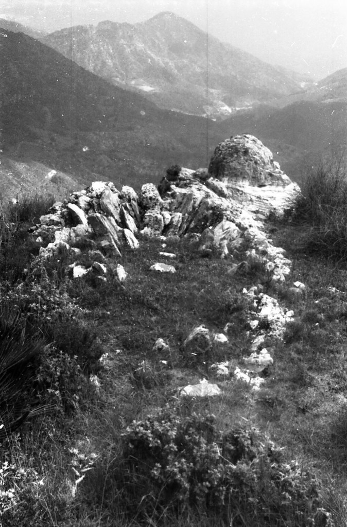 Foto 46.- Casi sobre la misma cresta de la considerada acrópolis, vemos los restos de las murallas que ocupaban la fachada delantera de esta cadena de alturas. Discurren, como se ha dicho antes, formando una cadena defensiva hasta el final de este primer tramo de picos-alturas. La estructura de los muros no es homogénea, sino que se adapta a la pendiente o desnivel de la montaña adosándose y adaptándose a ella.
