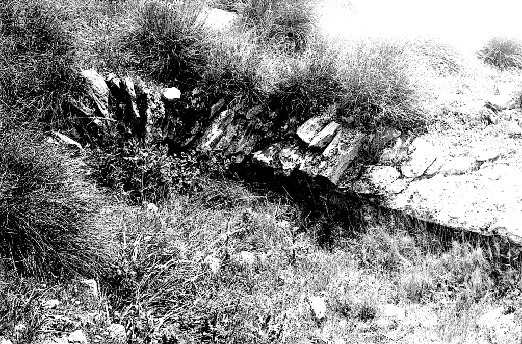Foto 39.- Aquí se muestran los restos de muros en la parte superior de la cornisa del primer tramo de la cadena de alturas. El sistema de aparejo es el mismo que se ha mostrado en la foto anterior. No se aprecia argamasa sino elementos de tierra del terreno; lo que explica que entre las piedras crezca la maleza.