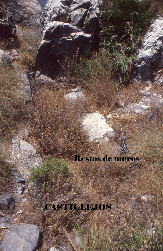 Fot. 36.- En la falda de la cadena de alturas de los Castillejos ya se empieza a ver restos de muros muy deteriorados bien por la erosión, bien por usar este legar como cantera para la construcción de los cortijos cercanos. Se observan dos niveles de muros que pensamos pertenecen a las viviendas citadas.