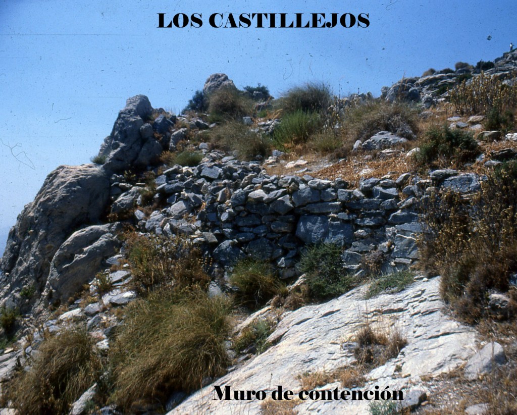 Foto 58.- Esta imagen demuestra la gran dificultad para intentar subir a la cima de los Castillejos. Vemos un muro de relleno de un vacío sobre la pendiente, que nos hace ver la técnica de construcción que se usaba en estos casos. Aquí no se ve la argamasa ni material alguno de cohesión entre las piedras del aparejo.