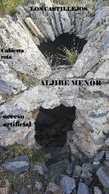 Foto 71.- Esta imagen desde el interior del aljibe muestra dos agujeros: el frontal es totalmente artificial. Ha sido abierto a golpe de pico. Y el central puede ser el original para extraer agua, pero probablemente agrandado posteriormente.