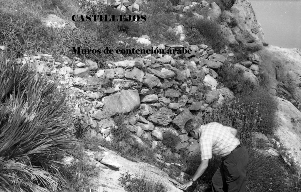 Foto 26.- Sobre la parte oeste se inicia la observación de los elementos claves para la clasificación de los usos que se hicieron de estos parajes montañosos. Se marca, en primer lugar, el sitio donde estuvo emplazado el cementerio árabe; a derecha comienza la zona destinada a casas, y en la zona inferior se indica el uso más frecuente de este terreno para establecer el poblado cuyos restos irán apareciendo a la largo de toda la falda de la montaña.