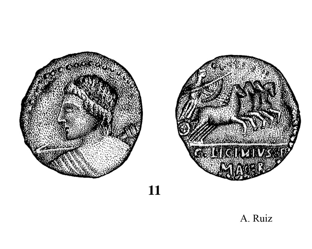 La moneda nº 15 se atribuye a Gayo Licinio Macer, acusado de concusión por Cicerón y, condenado por ello, se suicidó. Fue acuñada por este personaje cuando desempeñaba el cargo de triunviro monetario.