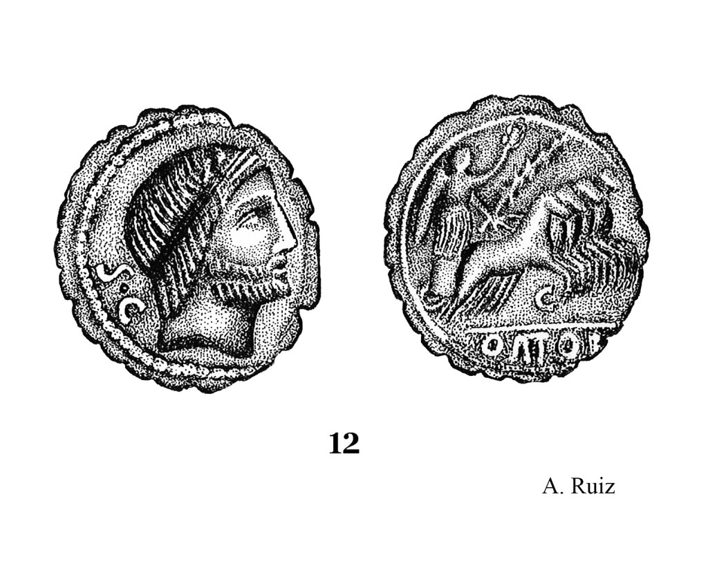 Y tratando de aclarar el tema cronológico, hay que aportar y explicar la cronología de las monedas, sobre todo la de las más recientes, que son las que pueden alterar lo tradicionalmente admitido. La mayoría de ellas se datan en una fecha alta, es decir, inicio del siglo II a. de C. Y las más recientes datan de mediados del siglo I a. de C., años 46-45 a. de C. (monedas 27 y 28). Y haciendo hincapié en las circunstancias del hallazgo, cabe decir que no fue un hallazgo superficial, sino que, quien guardó este peculio de monedas, tuvo intención clara de esconderlas por miedo a su extravío si las llevaba consigo en operaciones militares.